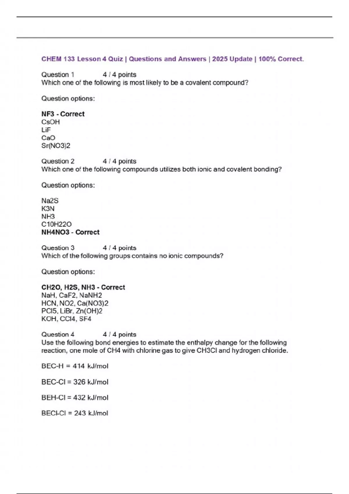 CHEM 133 Lesson 4 Quiz | Questions and Answers | 2025 Update | 100% Correct.