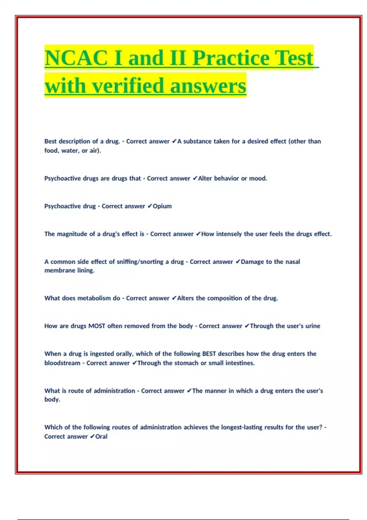 Psychoactive drug - Correct answer ✔Opium |||||| |||||| |||||| |||||| ||||||