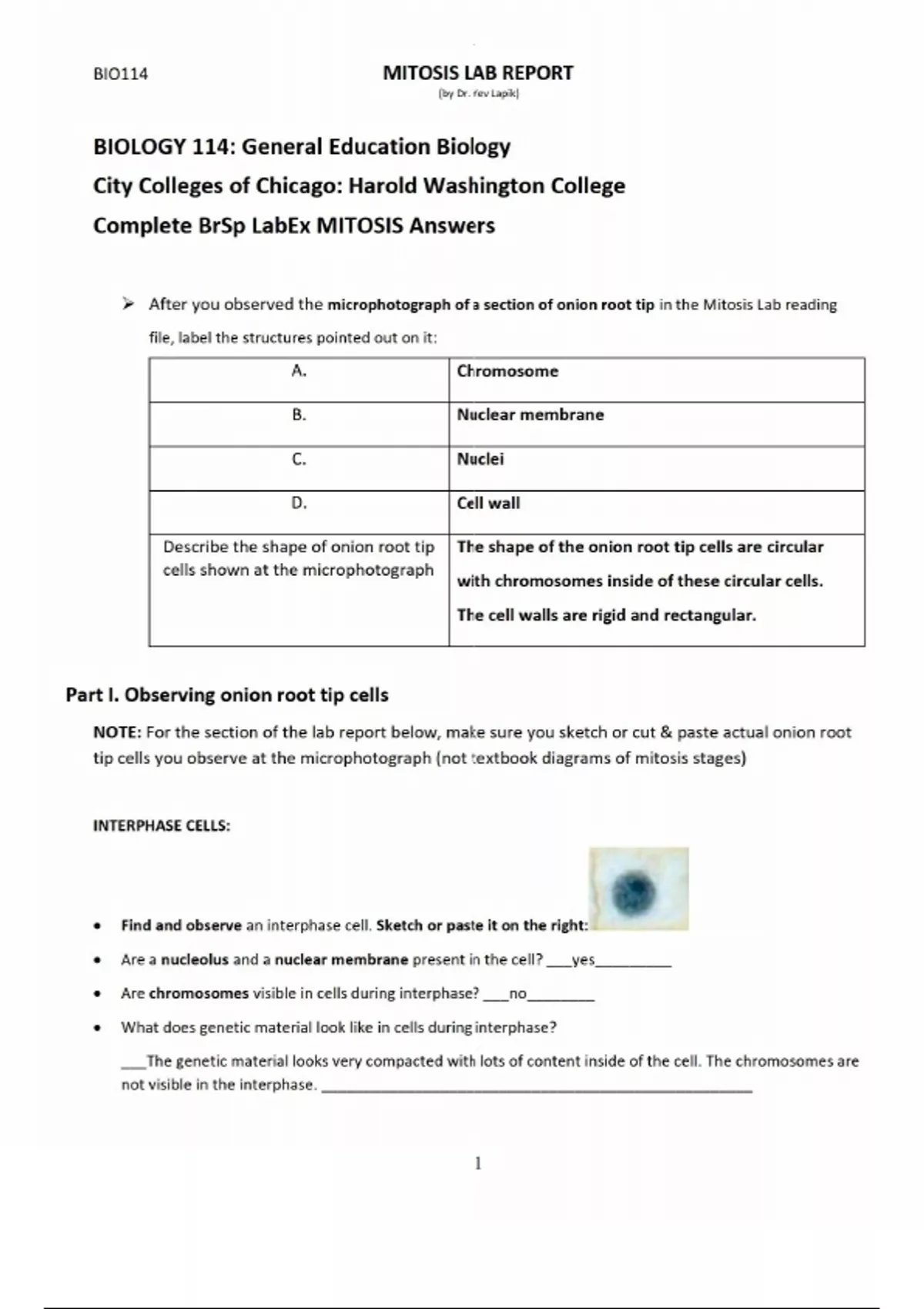 BIOLOGY 114 – Mitosis Lab Report | City Colleges of Chicago: Harold Washington College | Complete BrSp LabEx MITOSIS Answers