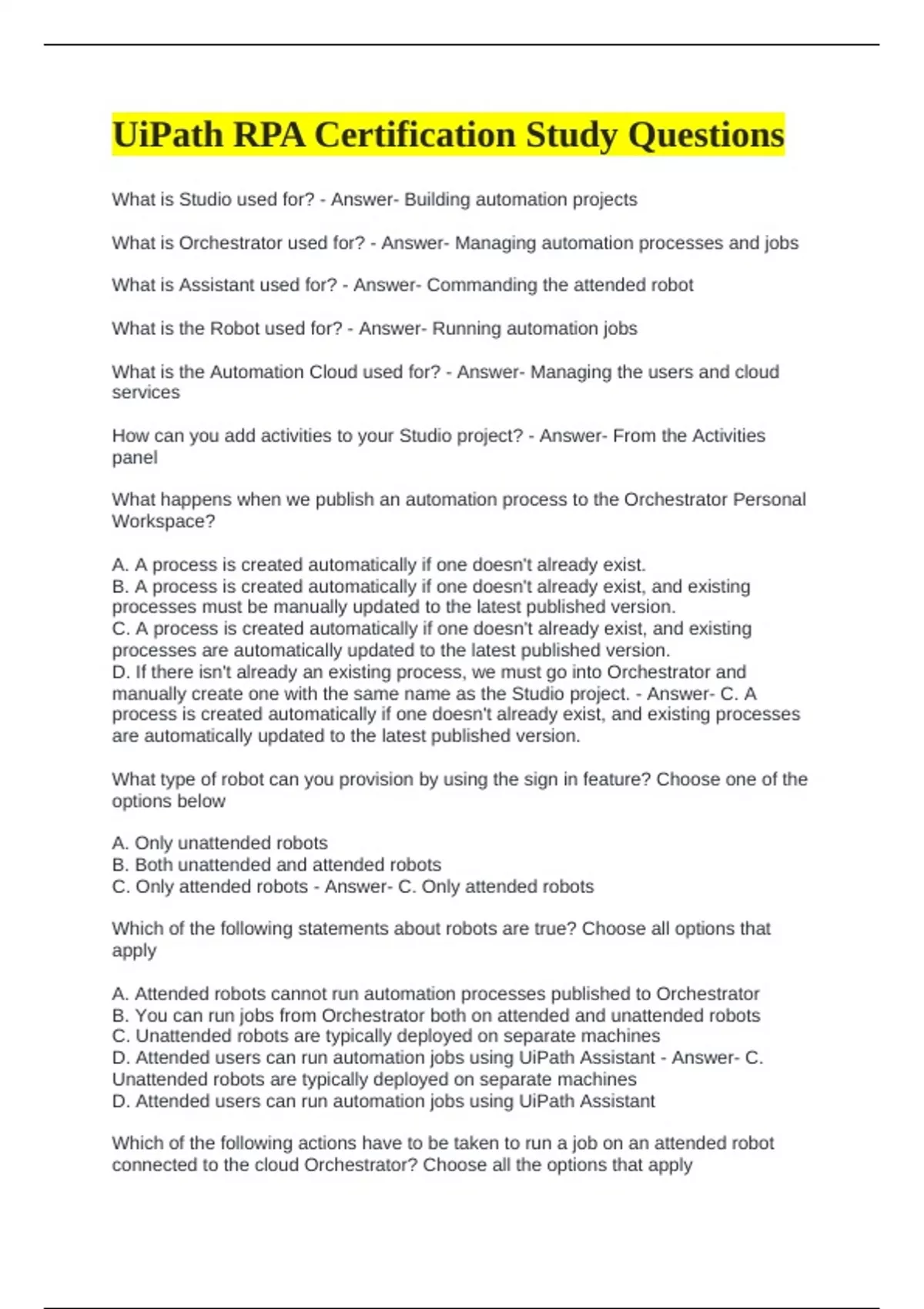 UiPath RPA Certification Study Questions What is Studio used for? - Answer- Building automation projects What is Orchestrator used for? - Answer- Managing automation processes and jobs What is Assistant used for? - Answer- Commanding the attended robot What is the Robot used for? - Answer- Running automation jobs What is the Automation Cloud used for? - Answer- Managing the users and cloud services How can you add activities to your Studio project? - Answer- From the Activities panel What happens when we publish an automation process to the Orchestrator Personal Workspace? A. A process is created automatically if one doesn't already exist. B. A process is created automatically if one doesn't already exist, and existing processes must be manually updated to the latest published version. C. A process is created automatically if one doesn't already exist, and existing processes are automatically updated to the latest published version. D. If there isn't already an existing process, we must go into Orchestrator and manually create one with the same name as the Studio project. - Answer- C. A process is created automatically if one doesn't already exist, and existing processes are automatically updated to the latest published version. What type of robot can you provision by using the sign in feature? Choose one of the options below A. Only unattended robots B. Both unattended and attended robots C. Only attended robots - Answer- C. Only attended robots Which of the following statements about robots are true? Choose all options that apply A. Attended robots cannot run automation processes published to Orchestrator B. You can run jobs from Orchestrator both on attended and unattended robots C. Unattended robots are typically deployed on separate machines D. Attended users can run automation jobs using UiPath Assistant - Answer- C. Unattended robots are typically deployed on separate machines D. Attended users can run automation jobs using UiPath Assistant Which of the following actions have to be taken to run a job on an attended robot connected to the cloud Orchestrator? Choose all the options that apply A. The user was added to Automation Cloud. B. The user has an Automation Developer — Named User' license type assigned. C. An automation process was published in Orchestrator, in a folder to which the user has access. D. The user is signed in to Orchestrator. - Answer- A. The user was added to Automation Cloud. C. An automation process was published in Orchestrator, in a folder to which the user has access. D. The user is signed in to Orchestrator. How can we leave out a specific file from the publishing package? Choose one answer. A. By deleting the specific file from the project folder in the Project panel in Studio. B. By right-clicking it in the Project panel, and then selecting Ignore from Publish in Studio. C. By disconnecting from Orchestrator. D. By moving the specific file in a read-only location. Correct - Answer- B. B