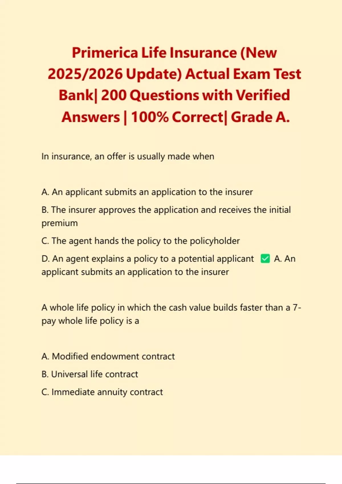 Primerica Life Insurance (New 2025/2026 Update) Actual Exam Test Bank| 200 Questions with Verified Answers | 100% Correct| Grade A. Primerica Life Insurance (New 2025/2026 Update) Actual Exam Test Bank| 200 Questions with Verified Answers | 100% Correct| Grade A.