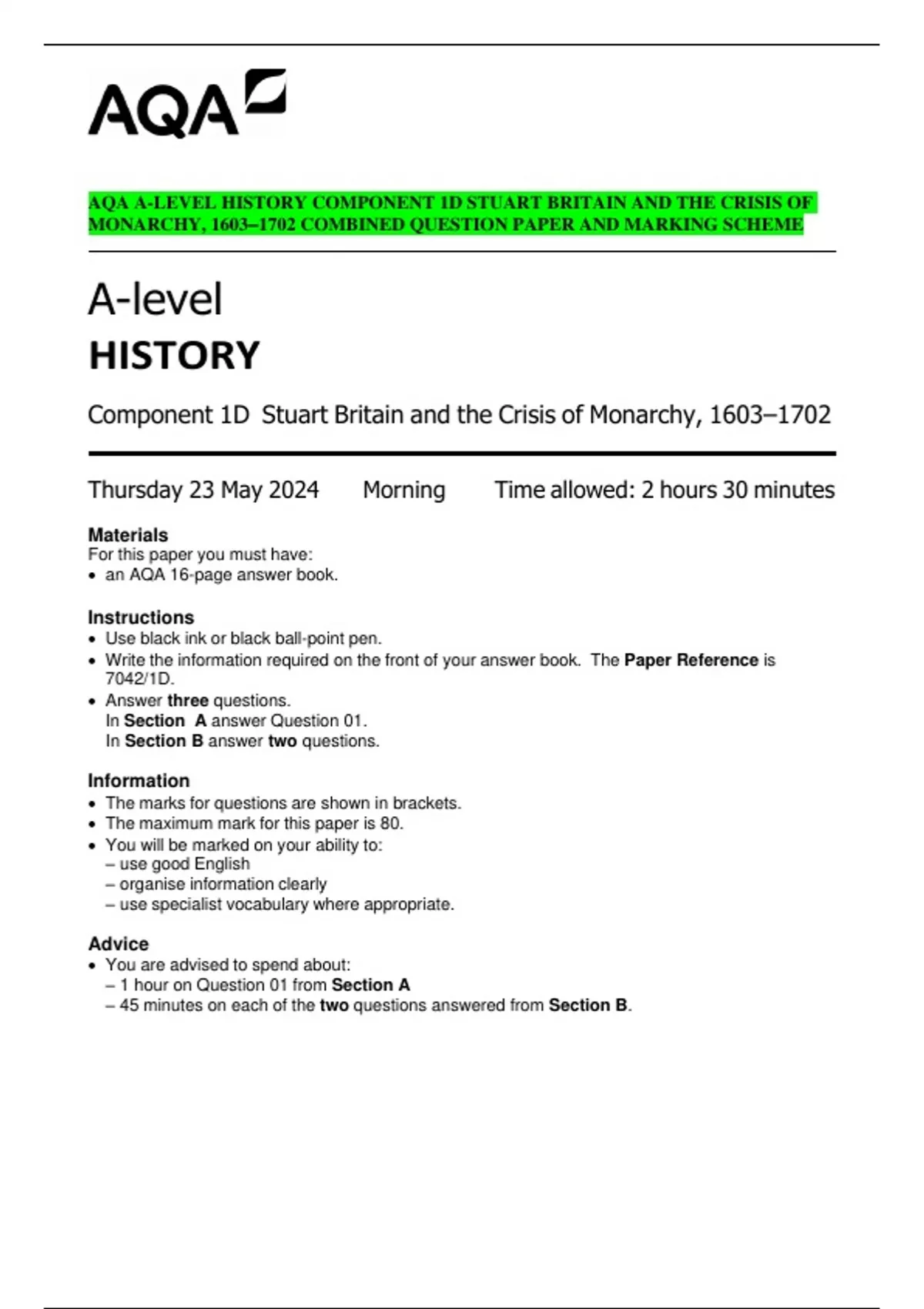 MONARCHY, 1603–1702 COMBINED QUESTION PAPER AND MARKING SCHEME