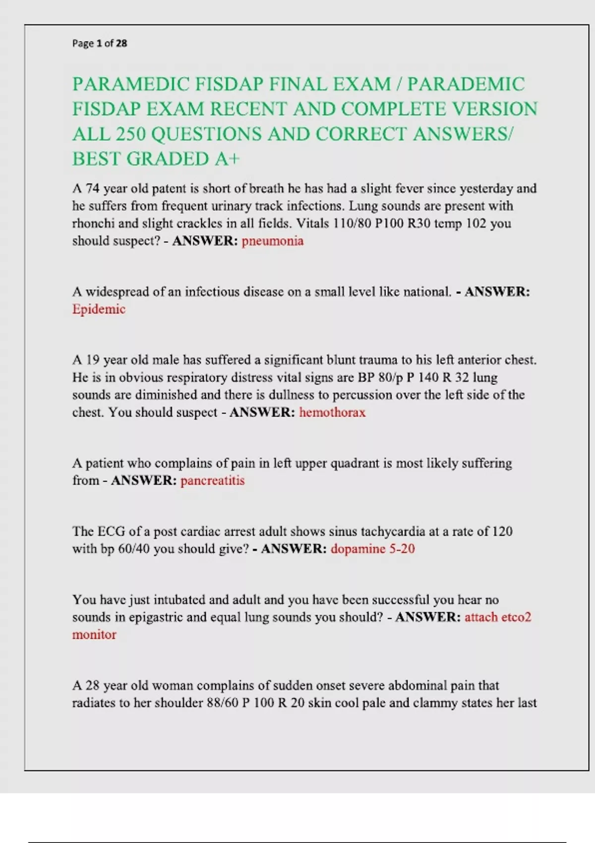 PARAMEDIC FISDAP FINAL EXAM PARADEMIC FISDAP EXAM RECENT AND COMPLETE VERSION ALL 250 QUESTIONS AND CORRECT ANSWERS BEST GRADED A+.
