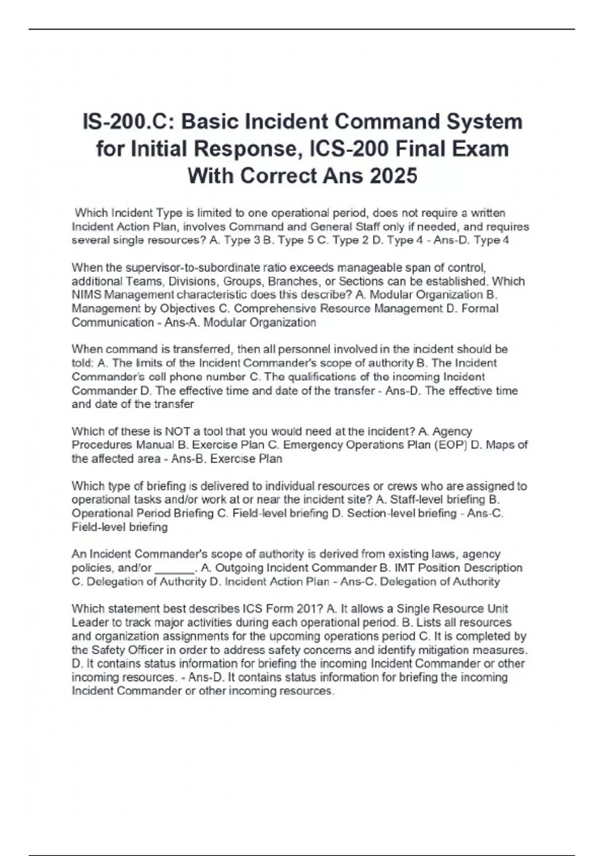 IS-200.C: Basic Incident Command System for Initial Response, ICS-200 Final Exam With Correct Ans 2025