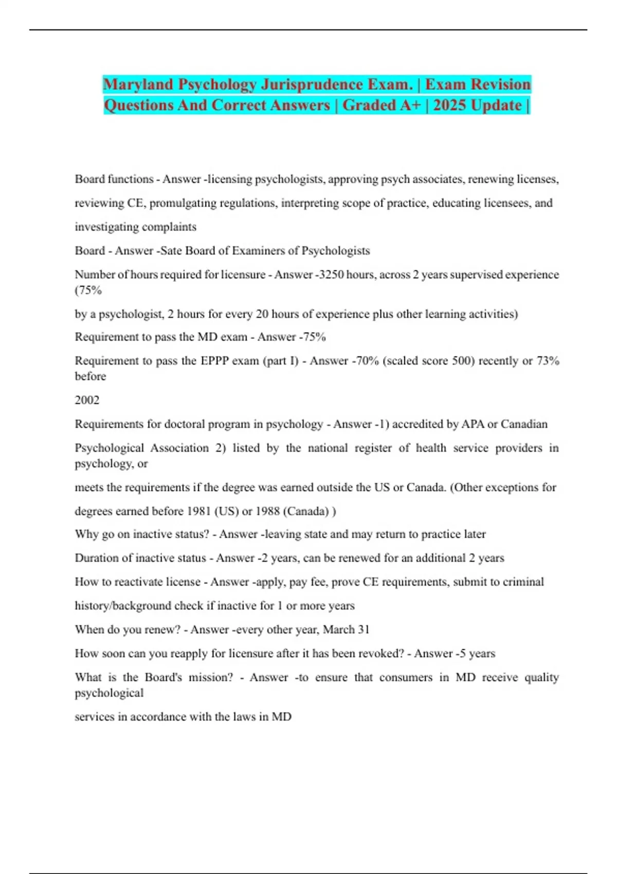 Maryland Psychology Jurisprudence Exam. | Exam Revision Questions And Correct Answers | Graded A+ | 2025 Update |
