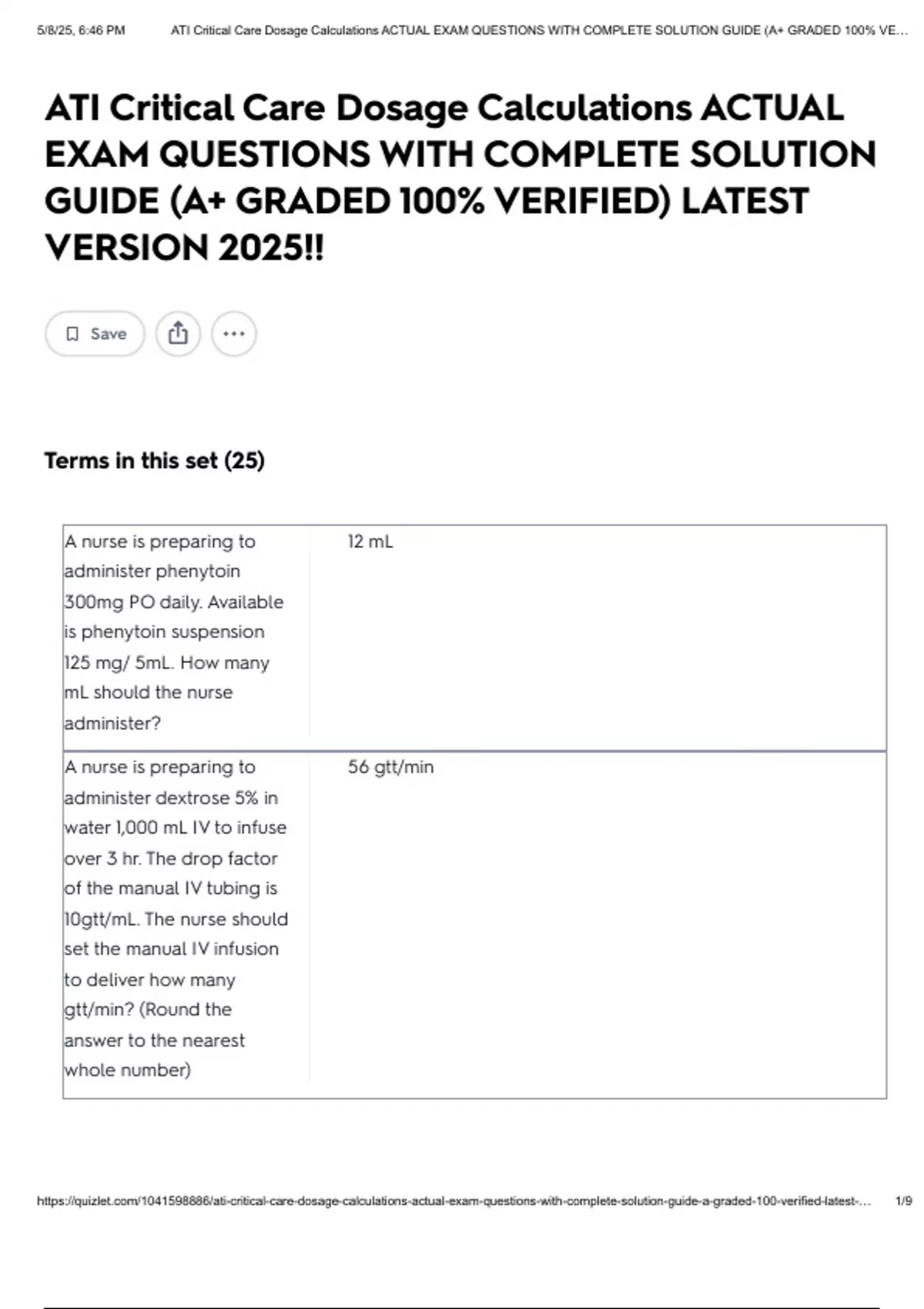 , 5/8/25, 6:46 PM ATI Critical Care Dosage Calculations ACTUAL EXAM QUESTIONS WITH COMPLETE SOLUTION GUIDE (A+ GRADED 100% VE…