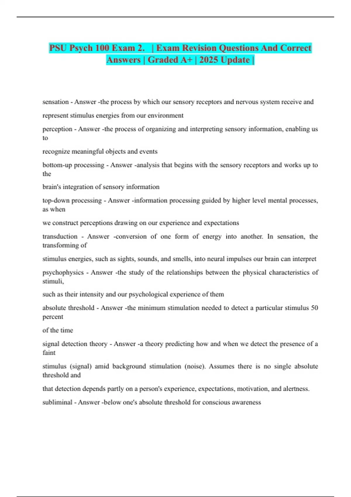 PSU Psych 100 Exam 2. | Exam Revision Questions And Correct