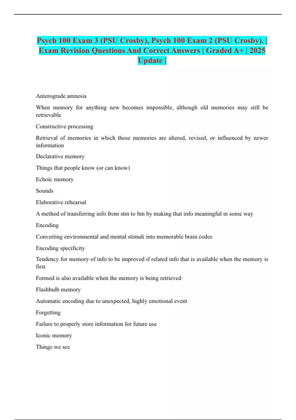 Psych 100 Exam 3 (PSU Crosby), Psych 100 Exam 2 (PSU Crosby). | Exam Revision Questions And Correct Answers | Graded A+ | 2025 Update |