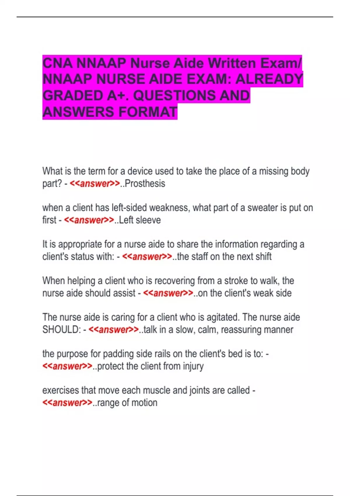 CNA NNAAP Nurse Aide Written Exam/ NNAAP NURSE AIDE EXAM: ALREADY GRADED A+. QUESTIONS AND ANSWERS FORMAT What is the term for a device used to take the place of a missing body part? - <<answer>>..Prosthesis