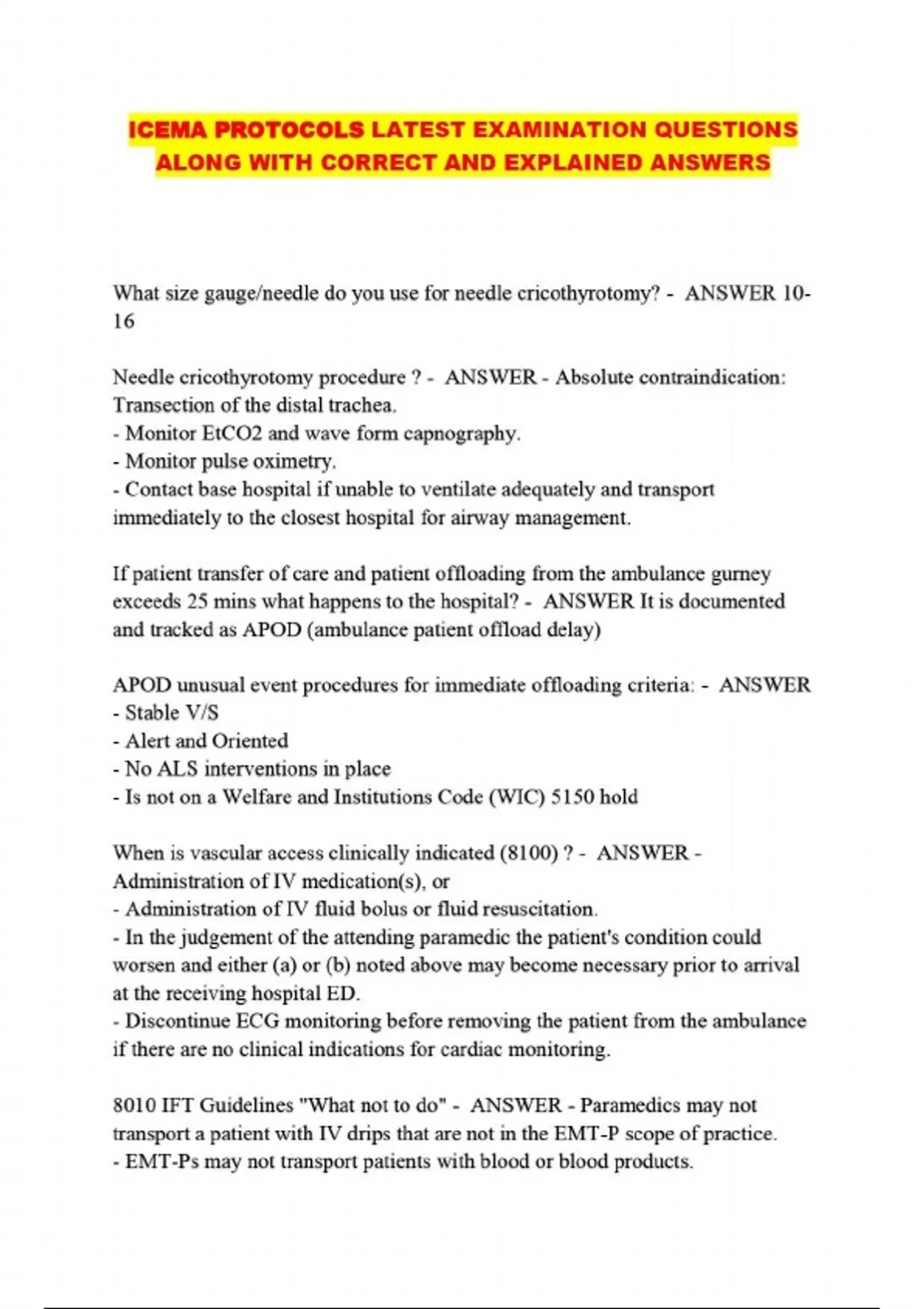 ICEMA PROTOCOLS LATEST EXAMINATION QUESTIONS ALONG WITH CORRECT AND EXPLAINED ANSWERS....