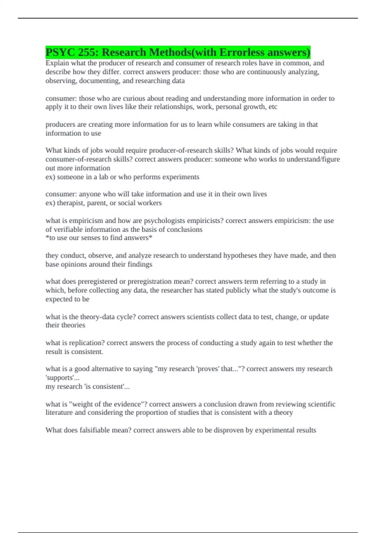 Explain what the producer of research and consumer of research roles have in common, and describe how they differ. correct answers producer: those who are continuously analyzing, observing, documenting, and researching data consumer: those who are curious about reading and understanding more information in order to apply it to their own lives like their relationships, work, personal growth, etc producers are creating more information for us to learn while consumers are taking in that information to use What kinds of jobs would require producer-of-research skills? What kinds of jobs would require consumer-of-research skills? correct answers producer: someone who works to understand/figure out more information ex) someone in a lab or who performs experiments consumer: anyone who will take information and use it in their own lives ex) therapist, parent, or social workers what is empiricism and how are psychologists empiricists? correct answers empiricism: the use of verifiable information as the basis of conclusions *to use our senses to find answers* they conduct, observe, and analyze research to understand hypotheses they have made, and then base opinions around their findings what does preregistered or preregistration mean? correct answers term referring to a study in which, before collecting any data, the researcher has stated publicly what the study's outcome is expected to be what is the theory-data cycle? correct answers scientists collect data to test, change, or update their theories what is replication? correct answers the process of conducting a study again to test whether the result is consistent. what is a good alternative to saying "my research 'proves' that..."? correct answers my research 'supports'... my research 'is consistent'... what is "weight of the evidence"? correct answers a conclusion drawn from reviewing scientific literature and considering the proportion of studies that is consistent with a theory What does falsifiable mean? correct answers able to be disproven by experimental results