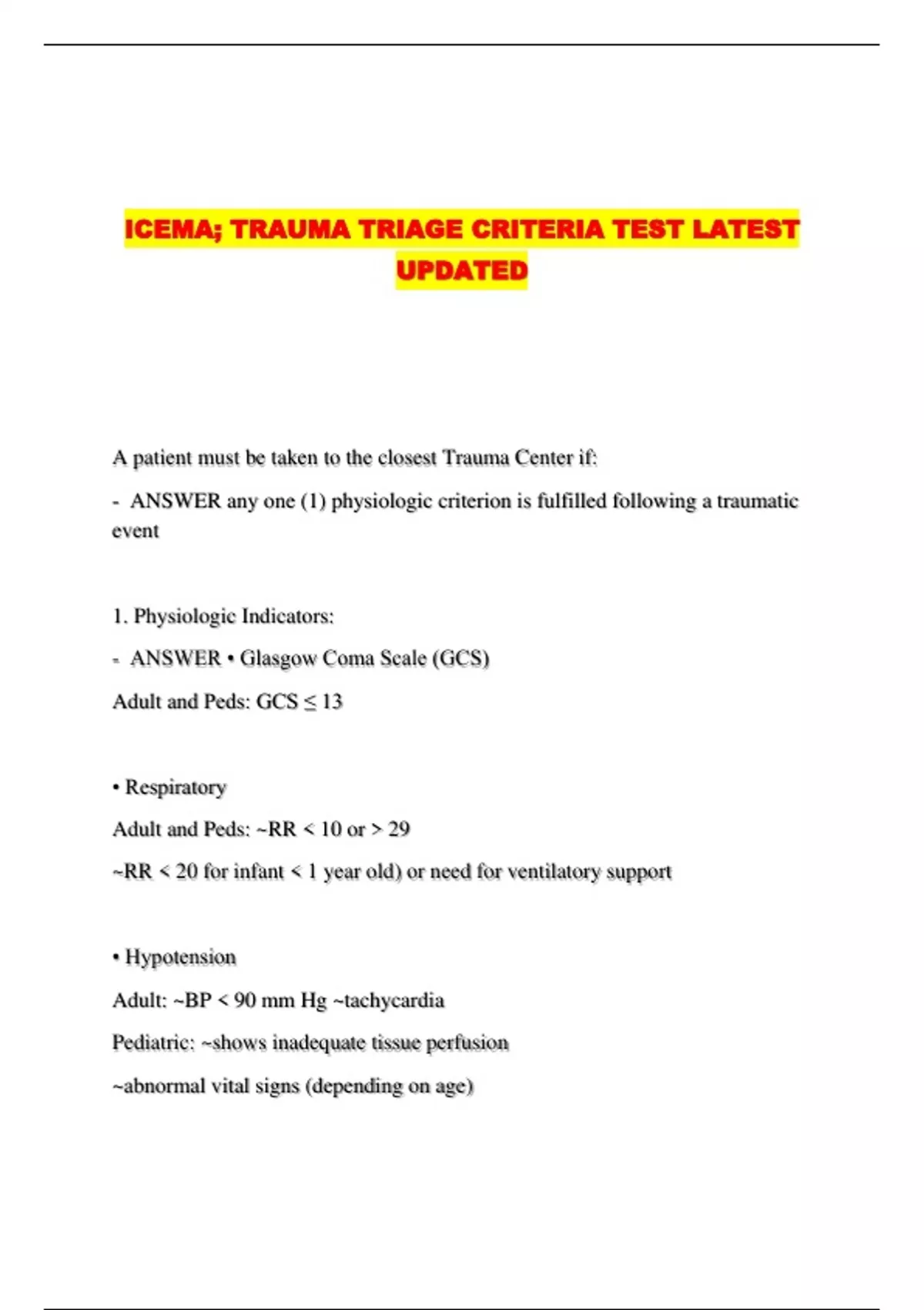 ICEMA; TRAUMA TRIAGE CRITERIA TEST LATEST UPDATED....