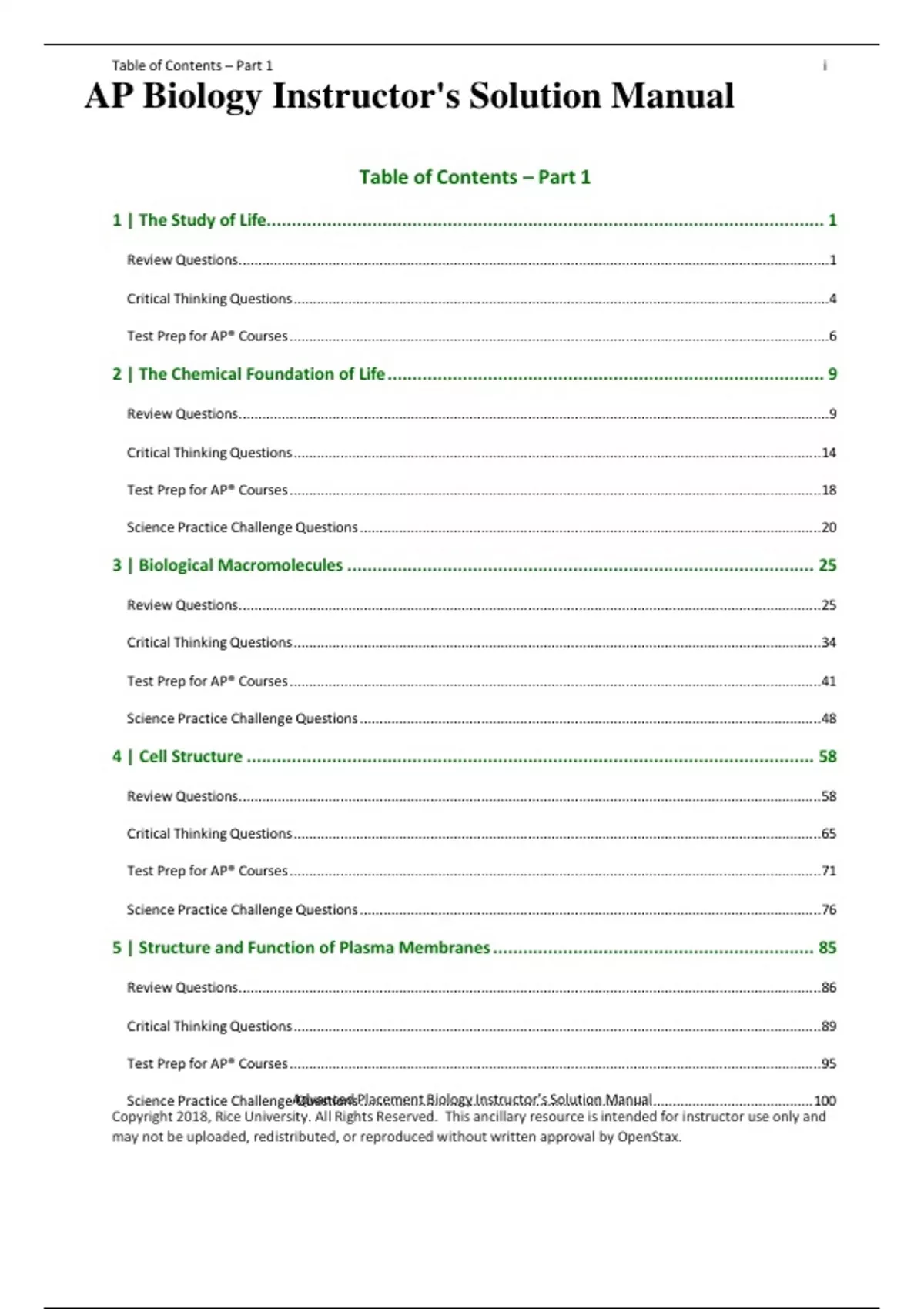 AP Biology Instructor's Solution Manual Table of Contents – Part 1 1 | The Study of Life............................................................................................................... 1 Review Questions.......................................................................................................................................................1 Critical Thinking Questions.........................................................................................................................................4 Test Prep for AP® Courses..........................................................................................................................................6 2 | The Chemical Foundation of Life....................................................................................... 9 Review Questions.......................................................................................................................................................9 Critical Thinking Questions.......................................................................................................................................14 Test Prep for AP® Courses........................................................................................................................................18 Science Practice Challenge Questions......................................................................................................................20 3 | Biological Macromolecules ............................................................................................. 25 Review Questions.....................................................................................................................................................25 Critical Thinking Questions.......................................................................................................................................34 Test Prep for AP® Courses........................................................................................................................................41 Science Practice Challenge Questions......................................................................................................................48 4 | Cell Structure ................................................................................................................. 58 Review Questions.....................................................................................................................................................58 Critical Thinking Questions.......................................................................................................................................65 Test Prep for AP® Courses........................................................................................................................................71 Science Practice Challenge Questions......................................................................................................................76 5 | Structure and Function of Plasma Membranes................................................................ 85 Review Questions.....................................................................................................................................................86 Critical Thinking Questions.......................................................................................................................................89 Test Prep for AP® Courses........................................................................................................................................95 Science Practice Challenge Questions....................................................................................................................100 ii Table of Contents – Part 1 Advanced Placement Biology Instructor’s Solution Manual 6 | Metabolism...................................................................................................................105 Review Questions...................................................................................................................................................105 Critical Thinking Questions.....................................................................................................................................114 Test Prep for AP® Courses......................................................................................................................................121 Science Practice Challenge Questions....................................................................................................................125 7 | Cellular Respiration .......................................................................................................136 Review Questions...................................................................................................................................................136 Critical Thinking Questions.....................................................................................................................................143 Test Prep for AP® Courses......................................................................................................................................149 Science Practice Challenge Questions....................................................................................................................155 8 | Photosynthesis..............................................................................................................163 Review Questions...................................................................................................................................................163 Critical Thinking Questions.....................................................................................................................................169 Test Prep for AP® Courses...........................