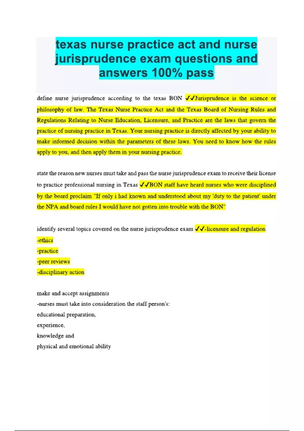 Texas nurse practice act and nurse jurisprudence exam questions and answers