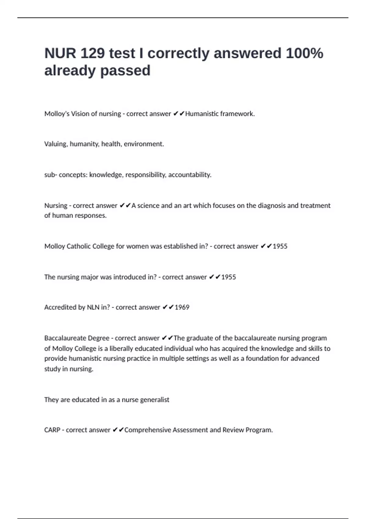 NUR 129 test I correctly answered 100% already passed