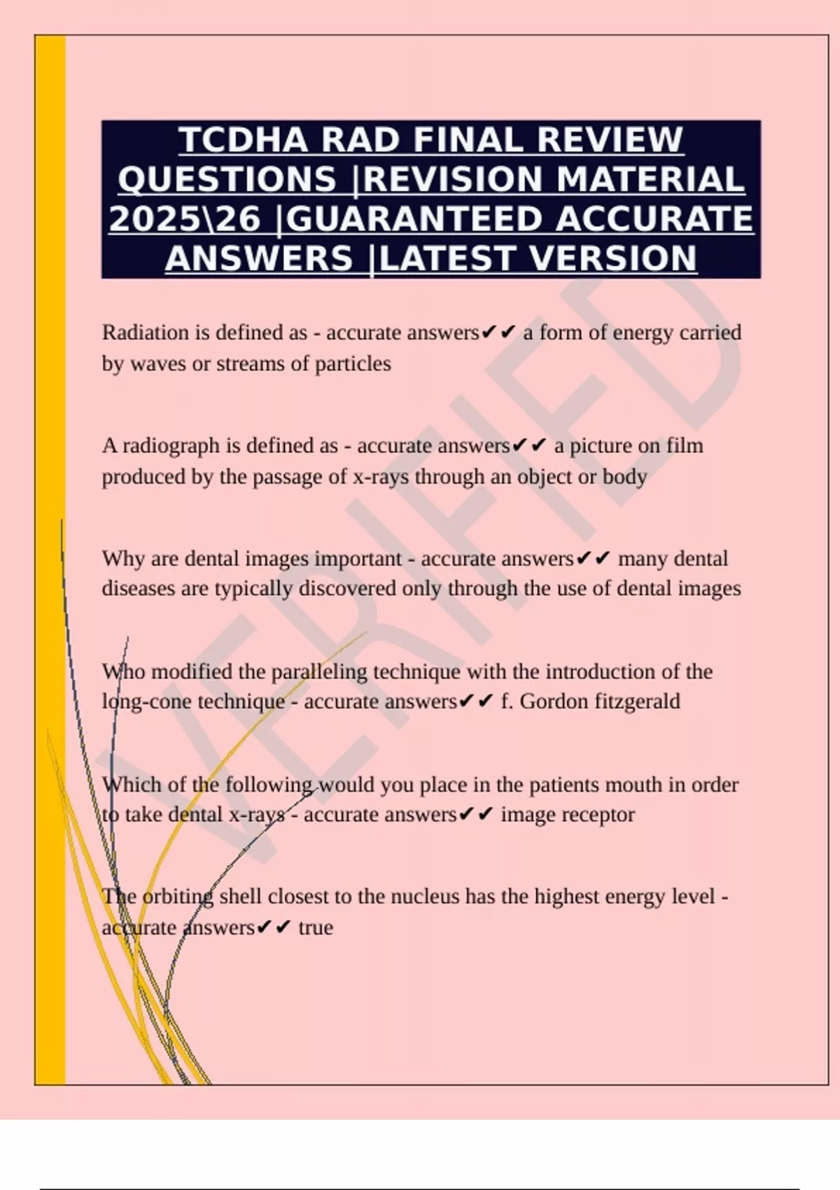 TCDHA RAD FINAL REVIEW QUESTIONS |REVISION MATERIAL 202526 |GUARANTEED ACCURATE ANSWERS |LATEST VERSION