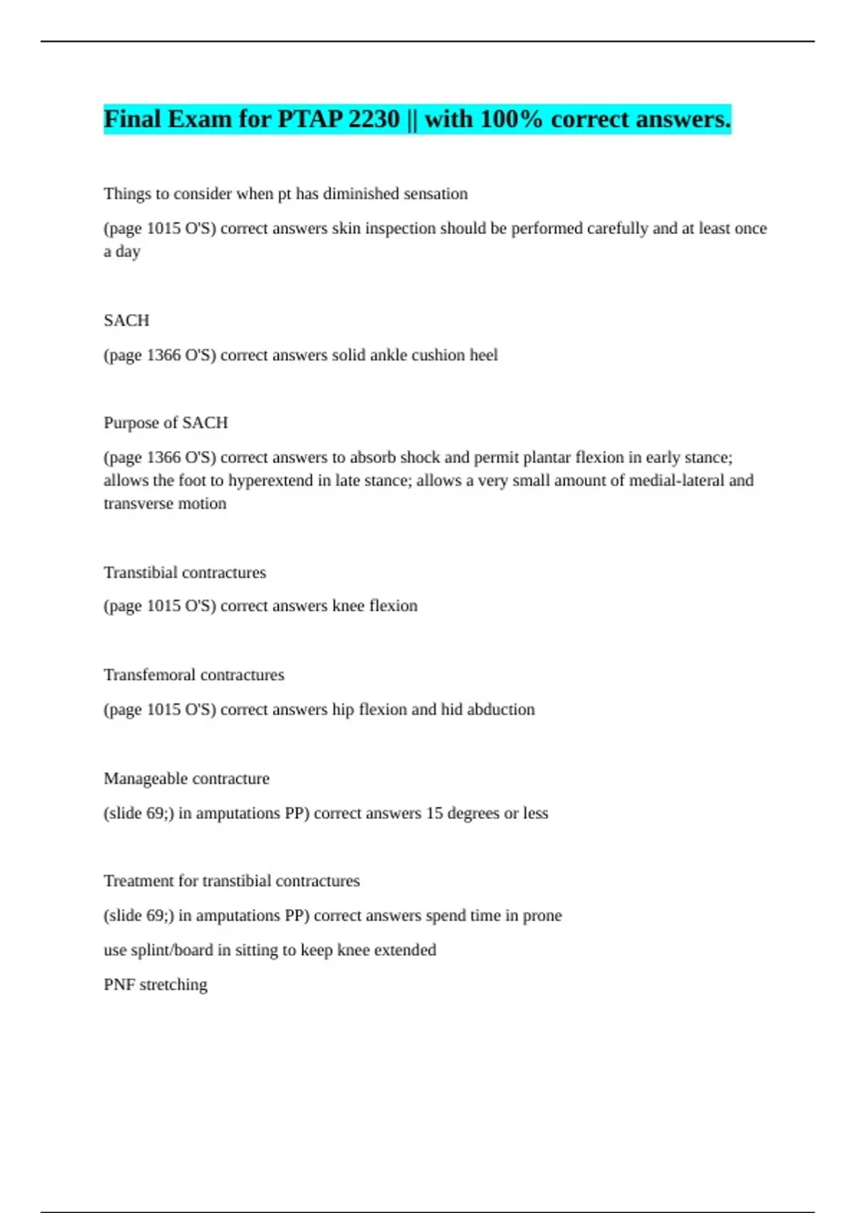 Things to consider when pt has diminished sensation (page 1015 O'S) correct answers skin inspection should be performed carefully and at least once a day SACH (page 1366 O'S) correct answers solid ankle cushion heel Purpose of SACH (page 1366 O'S) correct answers to absorb shock and permit plantar flexion in early stance; allows the foot to hyperextend in late stance; allows a very small amount of medial-lateral and transverse motion Transtibial contractures (page 1015 O'S) correct answers knee flexion Transfemoral contractures (page 1015 O'S) correct answers hip flexion and hid abduction Manageable contracture (slide 69;) in amputations PP) correct answers 15 degrees or less Treatment for transtibial contractures (slide 69;) in amputations PP) correct answers spend time in prone use splint/board in sitting to keep knee extended PNF stretching