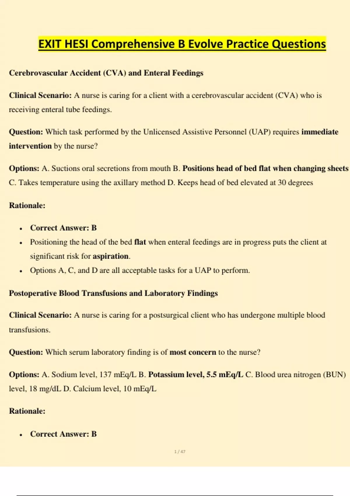 Question: Which serum laboratory finding is of most concern to the nurse?