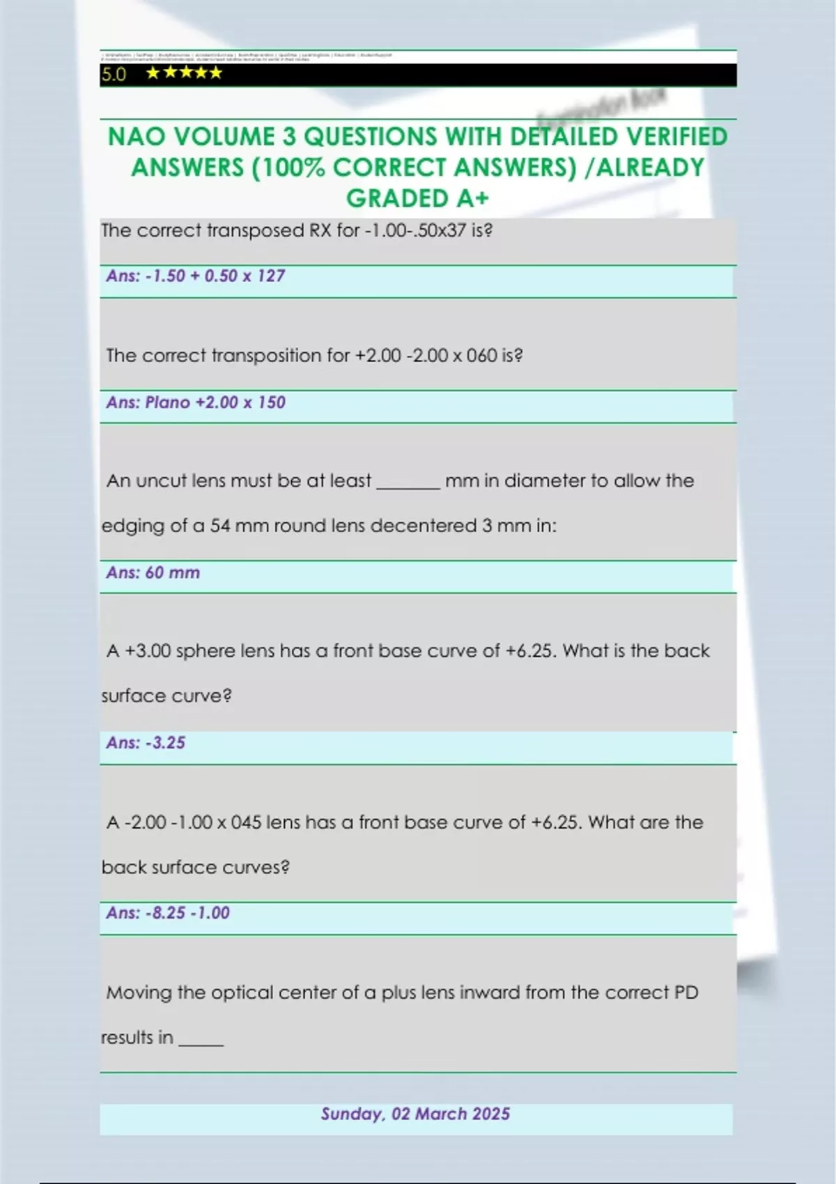 NAO VOLUME 3 QUESTIONS WITH DETAILED VERIFIED ANSWERS (100% CORRECT ANSWERS) /ALREADY GRADED A+ The correct transposed RX for -1.00-.50x37 is?