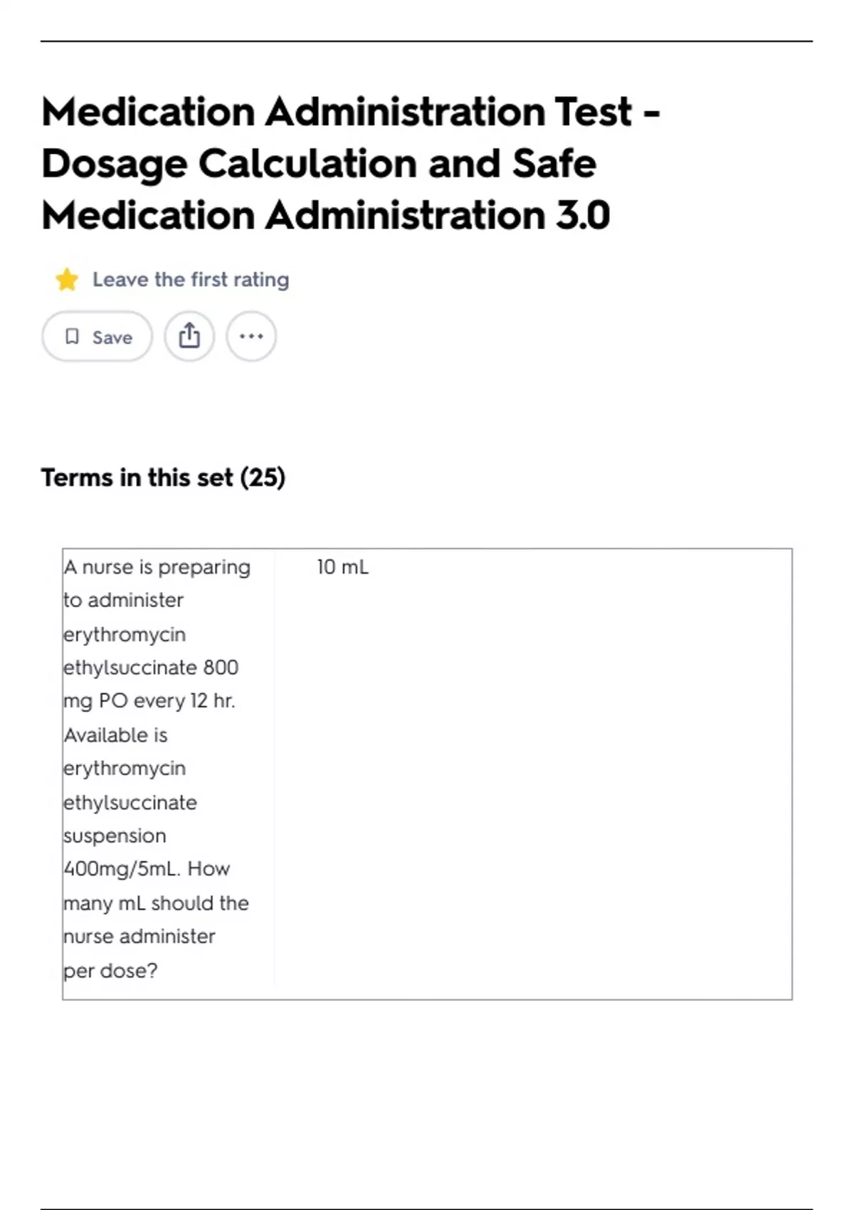 Medication Administration Test Dosage Calculation and Safe Medication Administration 3.0 Leave the first rating Save Terms in this set (25) A nurse is preparing to administer erythromycin ethylsuccinate 800 mg PO every 12 hr. Available is erythromycin ethylsuccinate suspension 400mg/5mL. How many mL should the nurse administer per dose? 10 mL A nurse is preparing to administer regular insulin 15 units and isophane insulin 40 units subcutaneous at 6:30 a.m. At which of the following times should the nurse administer the medication? 0630 A nurse is preparing to administer 0.9% sodium chloride 2,500 mL to infuse over 12 hr. The nurse should administer how many L? 2.5 L A nurse is preparing to administer levothyroxine 0.075 mg PO to a client. Available is levothyroxine 25 mcg tablets. How many tablets should the nurse administer? 3 tablets
