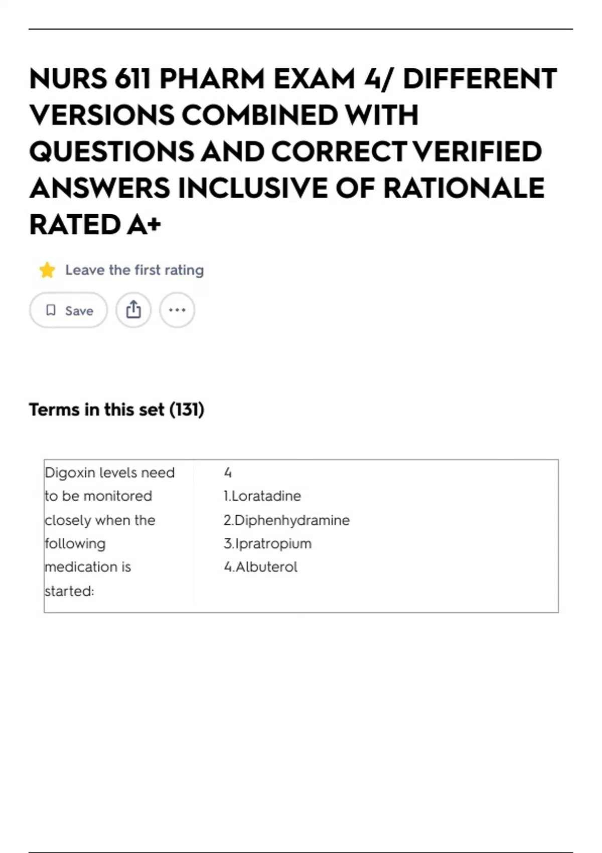 NURS 611 PHARM EXAM 4/ DIFFERENT VERSIONS COMBINED WITH QUESTIONS AND CORRECT VERIFIED ANSWERS INCLUSIVE OF RATIONALE RATED A+ Leave the first rating Save Terms in this set (131) Digoxin levels need to be monitored closely when the following medication is started: 4 1.Loratadine 2.Diphenhydramine 3.Ipratropium 4.Albuterol Patients with pheochromocytom a should avoid which of the following classes of drugs because of the possibility of developing hypertensive crisis? 2 1. Expectorants 2. Beta-2-agonists 3. Antitussives 4. Antihistamines Harold, a 42-year old African American, has moderate persistent asthma. Which of the following asthma medications should be used cautiously, if at all? 2 1. Betamethasone, an inhaled corticosteroid 2. Salmeterol, an inhaled long-acting beta agonist 3. Albuterol, a short-acting beta-agonist 4. Montelukast, a leukotriene modifier Long-acting beta agonists (LTBAs) received a Black Box Warning from the U.S. Food and Drug Administration due to the: 3 1. Risk of life-threatening dermatological reactions 2. Increased incidence of cardiac events when LTBAs are used 3. Increased risk of asthma-related deaths when LTBAs are used 4. Risk for life-threatening alterations in electrolytes The bronchodilator of choice for patients taking propranolol is: 4 1. Albuterol 2. Pirbuterol 3. Formoterol 4. Ipratropium