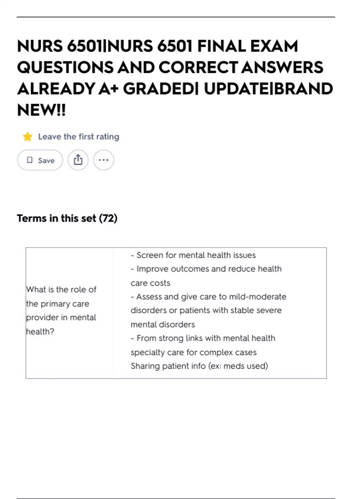 NURS 6501|NURS 6501 FINAL EXAM QUESTIONS AND CORRECT ANSWERS ALREADY A+ GRADED| UPDATE|BRAND NEW!! Leave the first rating Save Terms in this set (72) What is the role of the primary care provider in mental health?- Screen for mental health issues- Improve outcomes and reduce health care costs- Assess and give care to mild-moderate disorders or patients with stable severe mental disorders- From strong links with mental health specialty care for complex cases Sharing patient info (ex: meds used) about PHQ2- what does it screen for, what are the questions, scoring- Screens for MDD- It is the first two questions of the PHQ9- In the last two week, have you been feeling these (not at all, several days, more than half the day, nearly everyday):- Little interest or pleasure in doing things?- Feeling down, depressed, or hopeless? Scoring: A single yes or score >3 (out of 0-6) = possible clinical depression ⇒ due the PHQ9 If the pt screens (+) ⇒ continue to eval with the PHQ9 Used for screening, diagnosing, and treating- It asks about functioning impairments which is needed for the DSM-based diagnosis Includes asking about suicide or hurting self about PHQ9- what its used for, questions, scoring What is the appropriate initiation dose for fluoxetine for adults and geriatric adults? Scoring: 0-27 available 0-4: Minimal/none Monitor; may not require treatment 5-9: Mild Use clinical judgment; follow-up in one month 10-14: Moderate Use clinical judgment; may need meds if functionally impaired 15-19: Moderately Severe Warrants active treatment with psychotherapy, meds, or combo 20-27: Severe Warrants active treatment with psychotherapy, meds, or combo