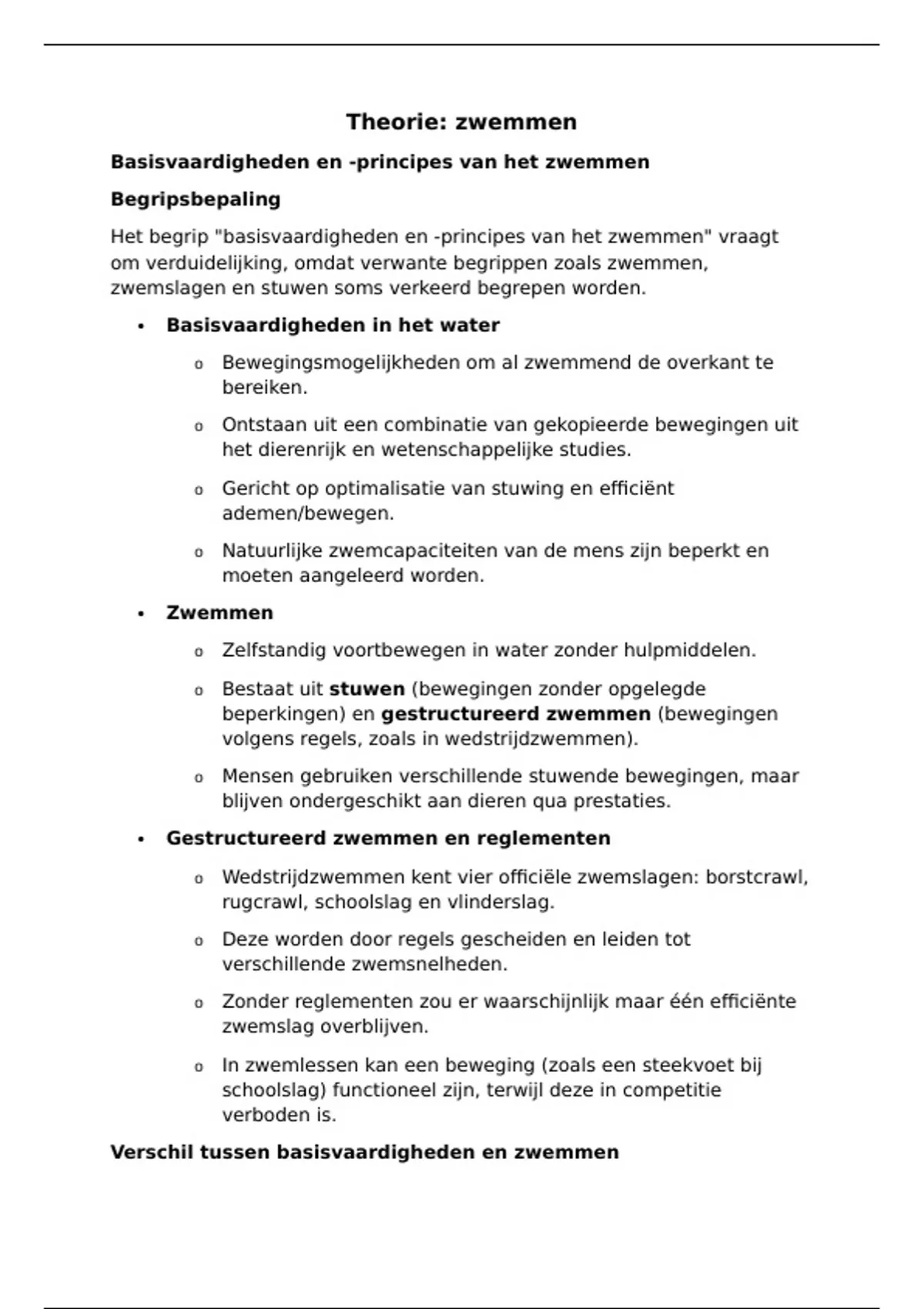 Complete en overzichtelijke samenvatting van het vak Zwemmen, zoals gedoceerd in de 1ste Bachelor Lichamelijke Opvoeding of Bewegingswetenschappen. Ideaal voor studenten die zich willen voorbereiden op het examen of een duidelijke houvast zoeken voor hun didactiek en techniektraining. Inhoud: Basiszwemslagen: schoolslag, crawl (voor- en rugcrawl), rugslag Start- en keerpunten per slag Techniekanalyse per zwemstijl (lichaamspositie, arm- en beenslag, ademhaling) Didactische opbouw van zwemlessen (individueel en in groep) Foutenherkenning en correctie Watergewenning en basisvaardigheden: drijven, glijden, onder water gaan Veiligheid en lesorganisatie in en rond het zwembad Leeftijdsspecifieke aanpak en motorische ontwikkeling Evaluatiecriteria voor zwemslagen en testmomenten Link met bewegingsprincipes: weerstand, lift, impuls, stroomlijn