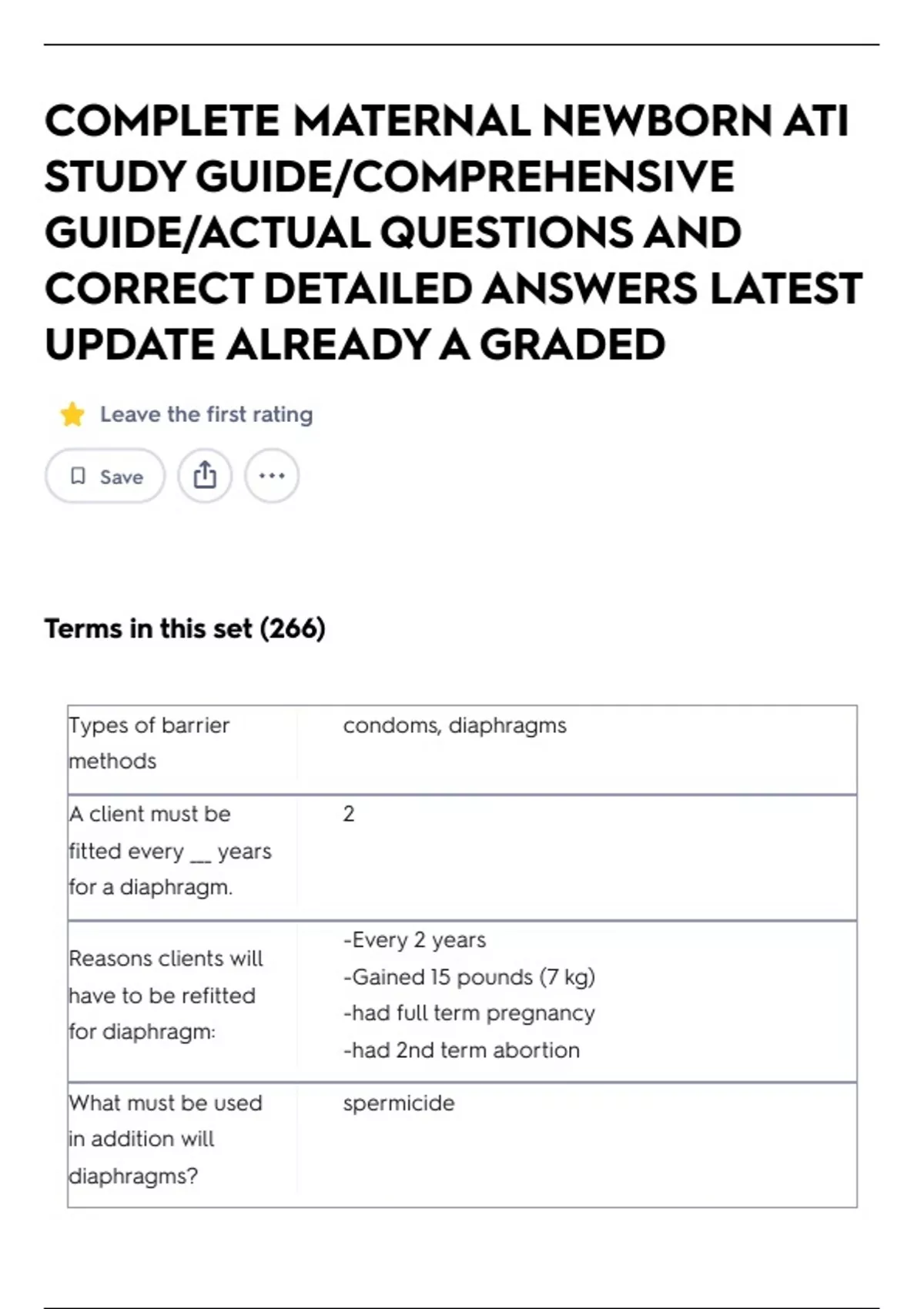 COMPLETE MATERNAL NEWBORN ATI STUDY GUIDE/COMPREHENSIVE GUIDE/ACTUAL QUESTIONS AND CORRECT DETAILED ANSWERS LATEST UPDATE ALREADY A GRADED Leave the first rating Save Terms in this set (266) Types of barrier methods condoms, diaphragms A client must be fitted every ___ years for a diaphragm. 2 Reasons clients will have to be refitted for diaphragm:-Every 2 years-Gained 15 pounds (7 kg)-had full term pregnancy-had 2nd term abortion What must be used in addition will diaphragms? spermicide A diaphragm must remain in place for ___ hours after intercourse. 6 True or False: Spermicide must be used with diaphragm for each act of intercourse. True Side effects of hormonal methods (oral, patch, Nuva Ring) of contraception: chest pain, SOB, leg pain (possible clot), headache, eye problems, HTN Hormonal methods risks-blood clots, leading to a stroke or PE