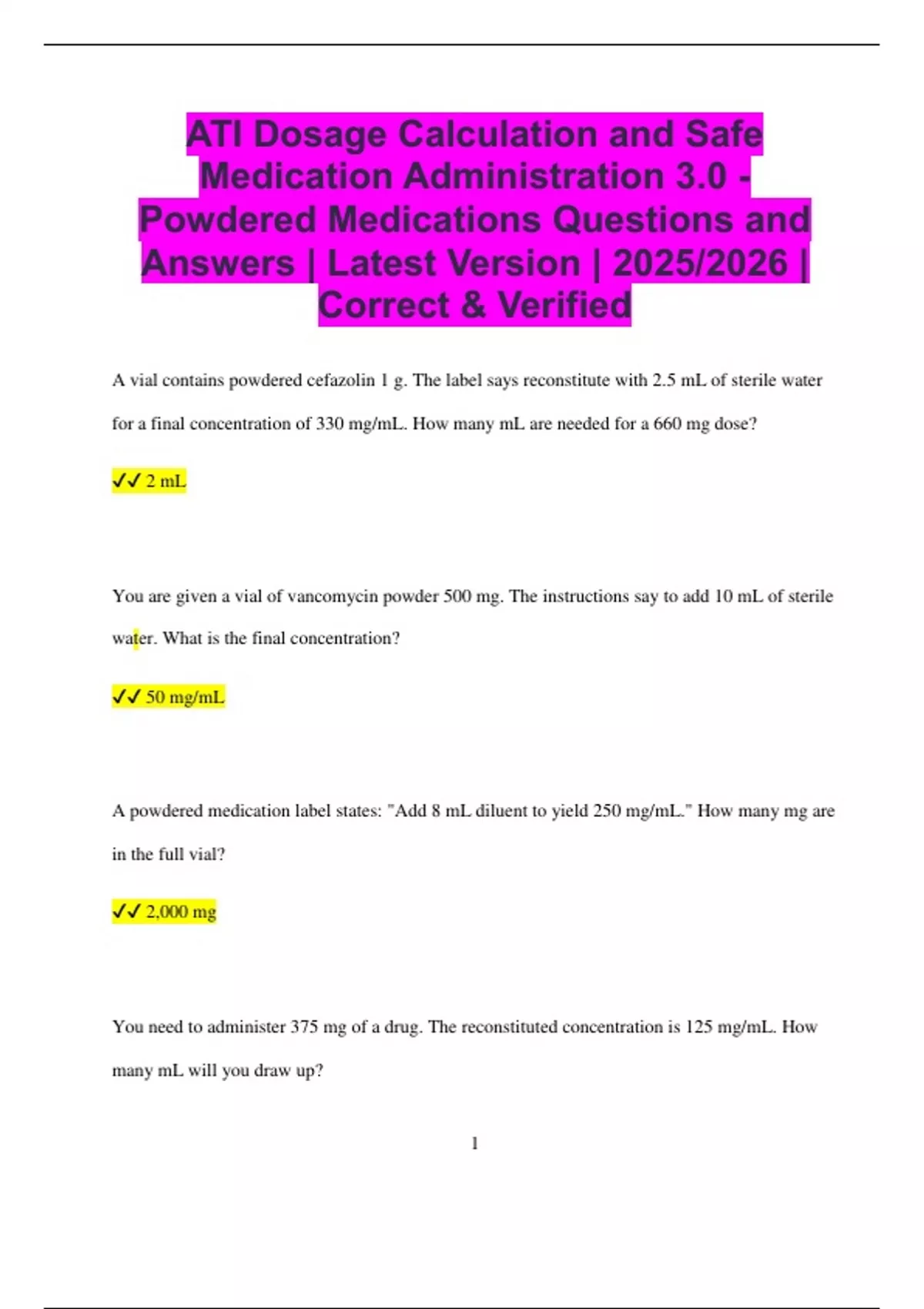 After reconstitution, a medication contains 500 mg in 4 mL. What is the concentration per mL?