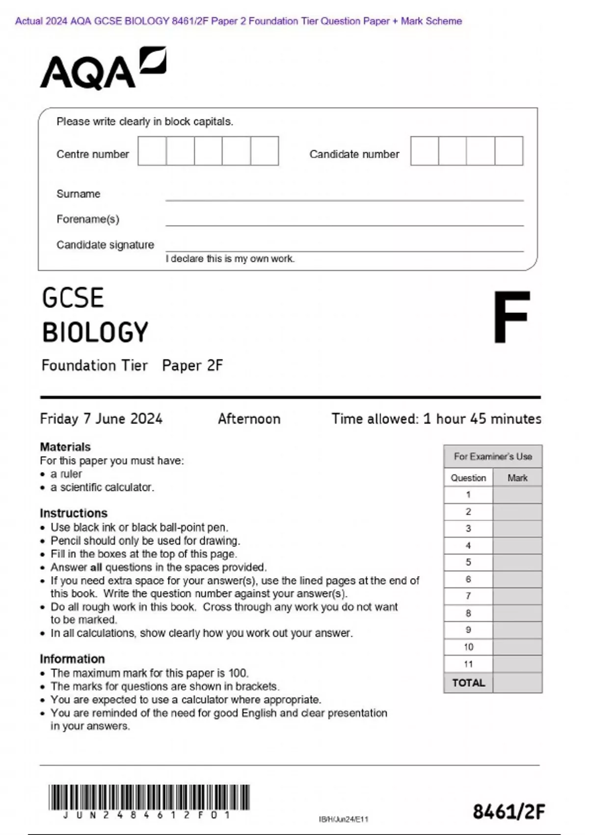 - Actual 2024 AQA GCSE BIOLOGY 8461/2F Paper 2 Found