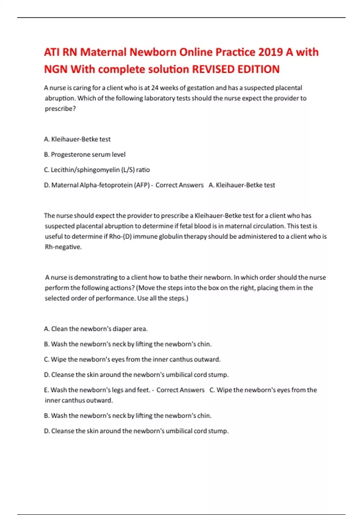 D. Maternal Alpha-fetoprotein (AFP) - Correct Answers A. Kleihauer-Betke test