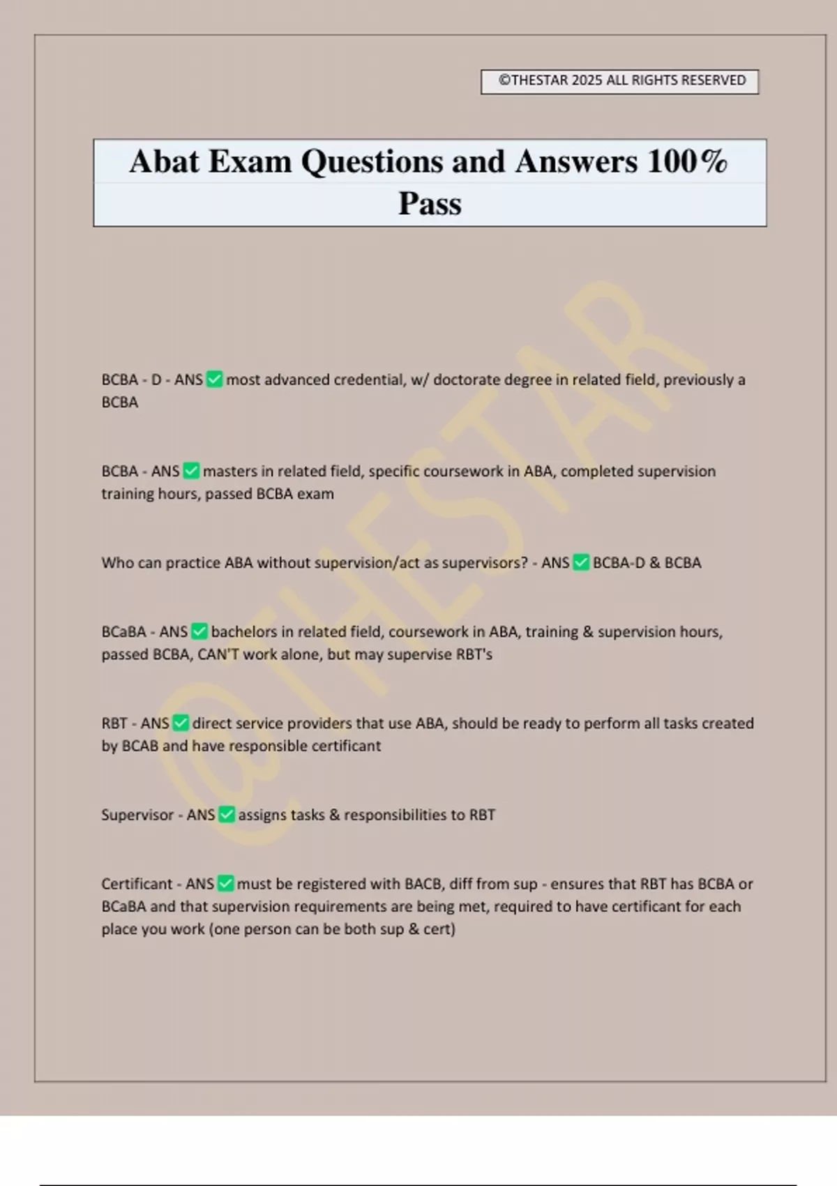 Certificant - ANS must be registered with BACB, diff from sup - ensures that RBT has BCBA or