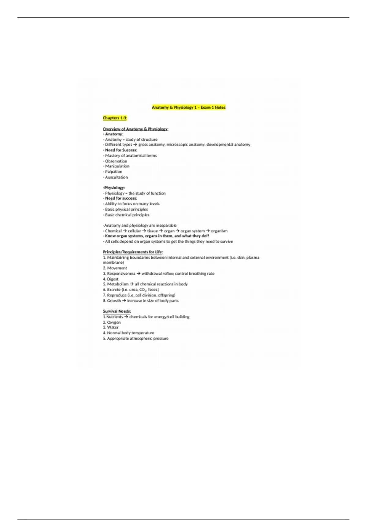 Summary BSC 2085C Exam 1 Review Notes