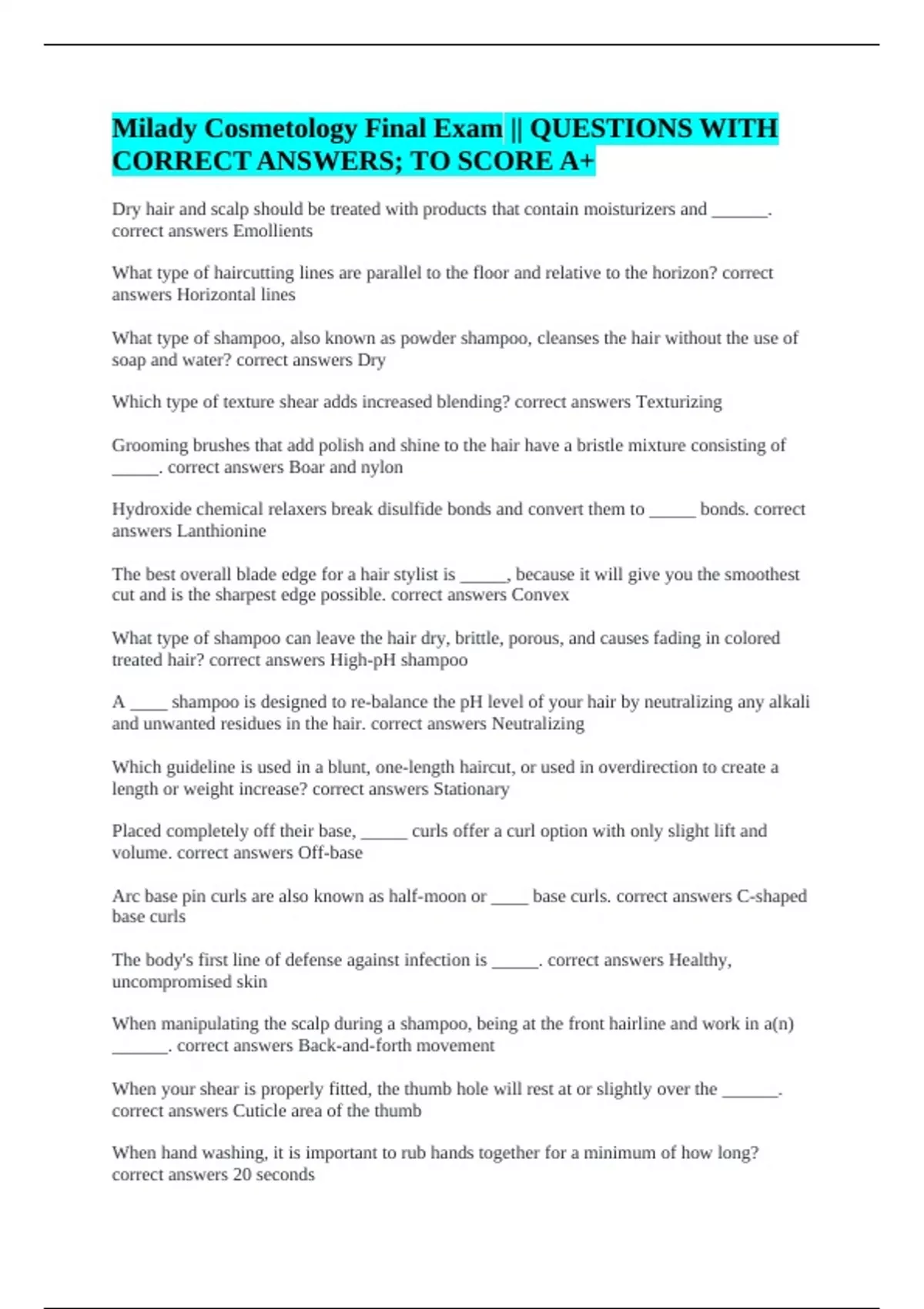 This document includes fully verified questions and correct answers for the Milady Cosmetology Final Exam. It covers all core topics: haircutting, chemical relaxers, skin care, anatomy, sanitation, hair structure, and styling techniques. Ideal for end-of-course state board review.