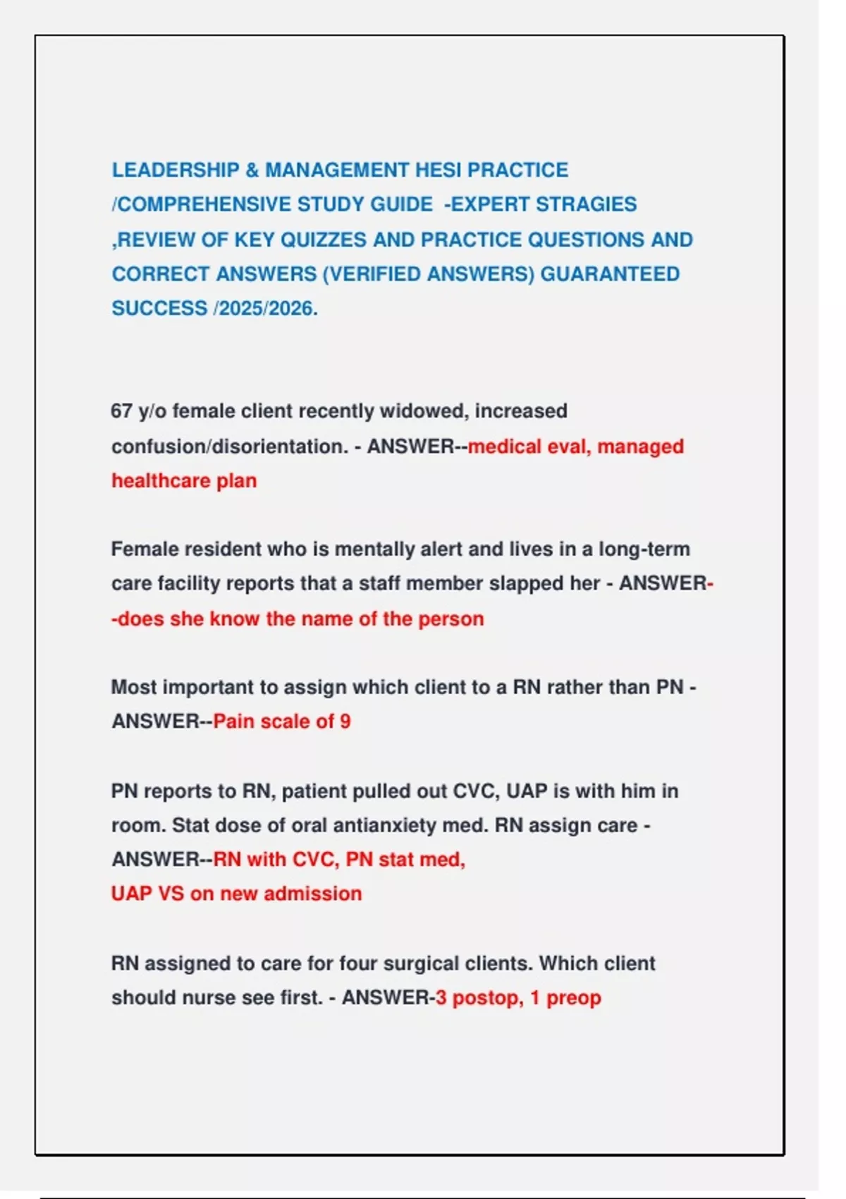LEADERSHIP & MANAGEMENT HESI PRACTICE /COMPREHENSIVE STUDY GUIDE -EXPERT STRAGIES ,REVIEW OF KEY QUIZZES AND PRACTICE QUESTIONS AND CORRECT ANSWERS (VERIFIED ANSWERS) GUARANTEED SUCCESS /2025/2026. LEADERSHIP & MANAGEMENT HESI PRACTICE /COMPREHENSIVE STUDY GUIDE -EXPERT STRAGIES ,REVIEW OF KEY QUIZZES AND PRACTICE QUESTIONS AND CORRECT ANSWERS (VERIFIED ANSWERS) GUARANTEED SUCCESS /2025/2026. LEADERSHIP & MANAGEMENT HESI PRACTICE /COMPREHENSIVE STUDY GUIDE -EXPERT STRAGIES ,REVIEW OF KEY QUIZZES AND PRACTICE QUESTIONS AND CORRECT ANSWERS (VERIFIED ANSWERS) GUARANTEED SUCCESS /2025/2026. LEADERSHIP & MANAGEMENT HESI PRACTICE /COMPREHENSIVE STUDY GUIDE -EXPERT STRAGIES ,REVIEW OF KEY QUIZZES AND PRACTICE QUESTIONS AND CORRECT ANSWERS (VERIFIED ANSWERS) GUARANTEED SUCCESS /2025/2026. LEADERSHIP & MANAGEMENT HESI PRACTICE /COMPREHENSIVE STUDY GUIDE -EXPERT STRAGIES ,REVIEW OF KEY QUIZZES AND PRACTICE QUESTIONS AND CORRECT ANSWERS (VERIFIED ANSWERS) GUARANTEED SUCCESS /2025/2026. LEADERSHIP & MANAGEMENT HESI PRACTICE /COMPREHENSIVE STUDY GUIDE -EXPERT STRAGIES ,REVIEW OF KEY QUIZZES AND PRACTICE QUESTIONS AND CORRECT ANSWERS (VERIFIED ANSWERS) GUARANTEED SUCCESS /2025/2026.