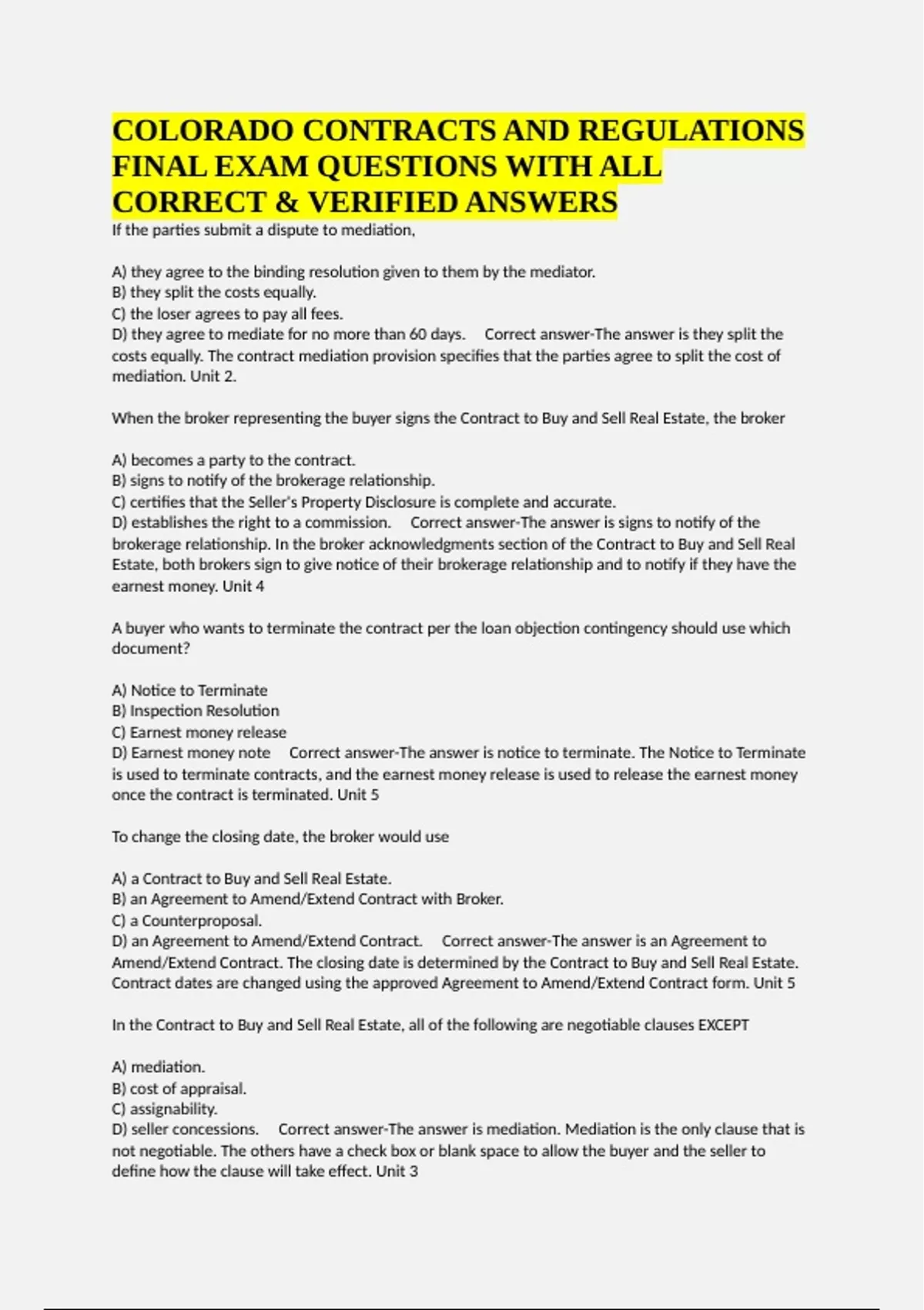 COLORADO CONTRACTS AND REGULATIONS FINAL EXAM QUESTIONS WITH ALL CORRECT & VERIFIED ANSWERS