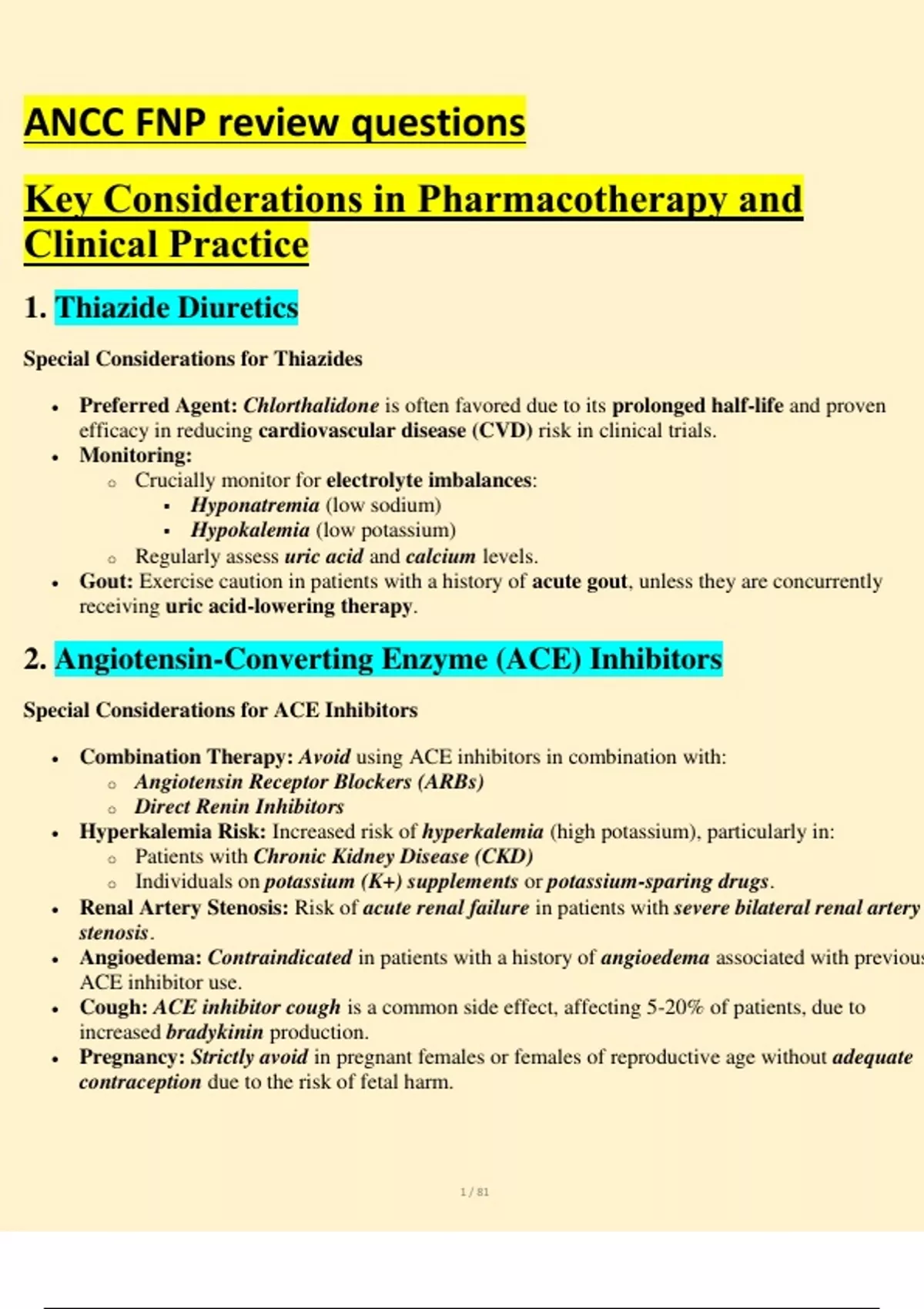 This comprehensive exam prep document presents over 80 ANCC FNP-style multiple-choice questions with detailed rationales. Topics include pharmacology, pediatrics, women’s health, infectious diseases, ENT, endocrinology, neurology, cardiology, psychiatry, geriatrics, and legal/ethical issues. Each question mirrors real board exam content, making this an effective tool for reinforcing clinical decision-making and knowledge recall.