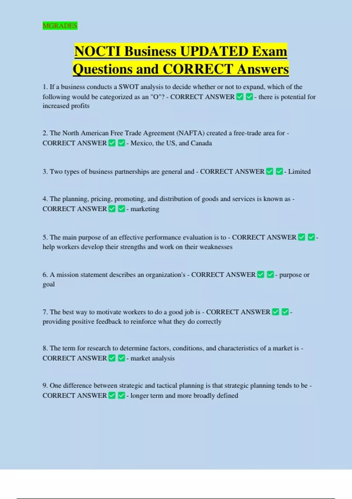 NOCTI Business UPDATED Exam Questions and CORRECT Answers 1. If a business conducts a SWOT analysis to decide whether or not to expand, which of the following would be categorized as an "O"? - CORRECT ANSWER - there is potential for increased profits 2. The North American Free Trade Agreement (NAFTA) created a free-trade area for - CORRECT ANSWER - Mexico, the US, and Canada 3. Two types of business partnerships are general and - CORRECT ANSWER - Limited