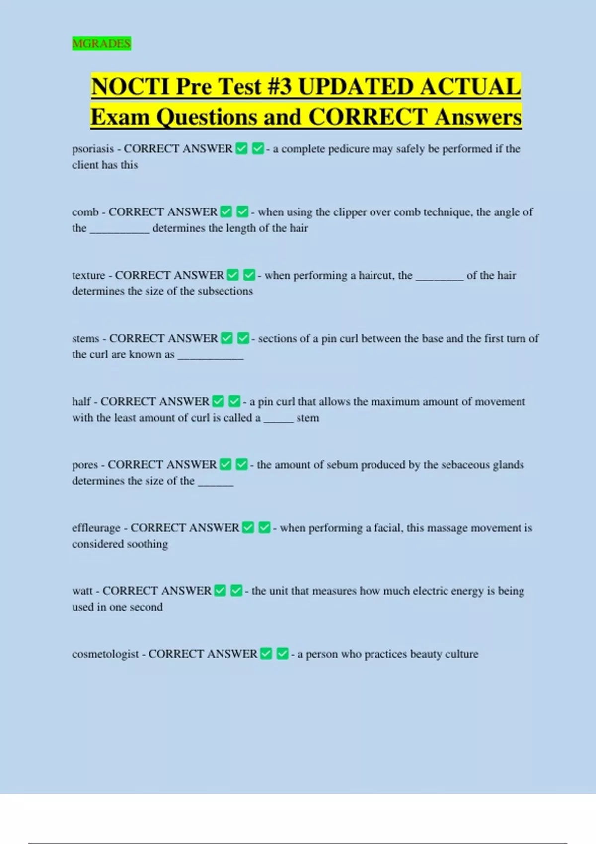 NOCTI Pre Test #3 UPDATED ACTUAL Exam Questions and CORRECT Answers psoriasis - CORRECT ANSWER client has this comb - CORRECT ANSWER - a complete pedicure may safely be performed if the - when using the clipper over comb technique, the angle of the __________ determines the length of the hair texture - CORRECT ANSWER determines the size of the subsections stems - CORRECT ANSWER - when performing a haircut, the ________ of the hair