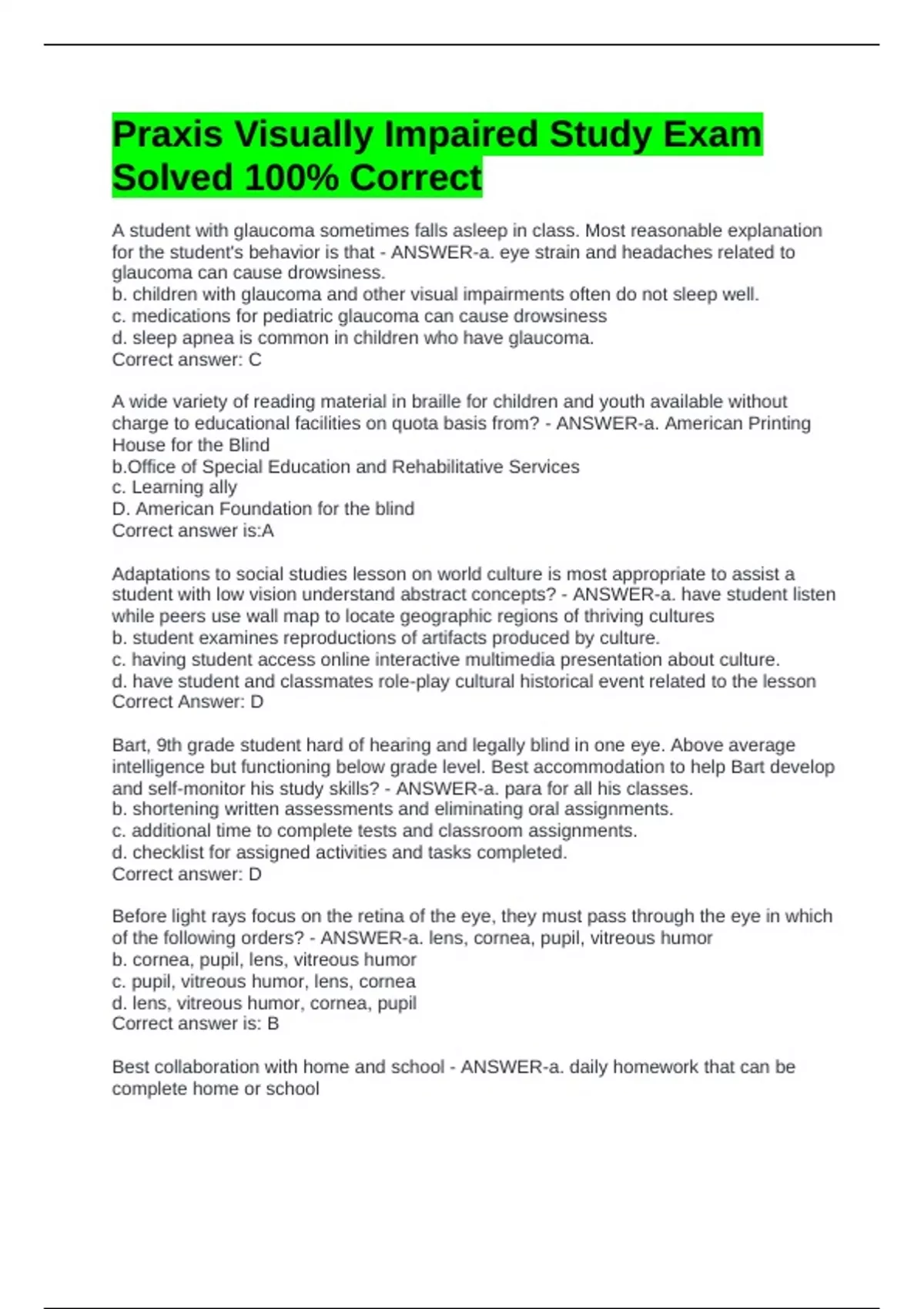 Praxis Visually Impaired Study Exam Solved 100% Correct