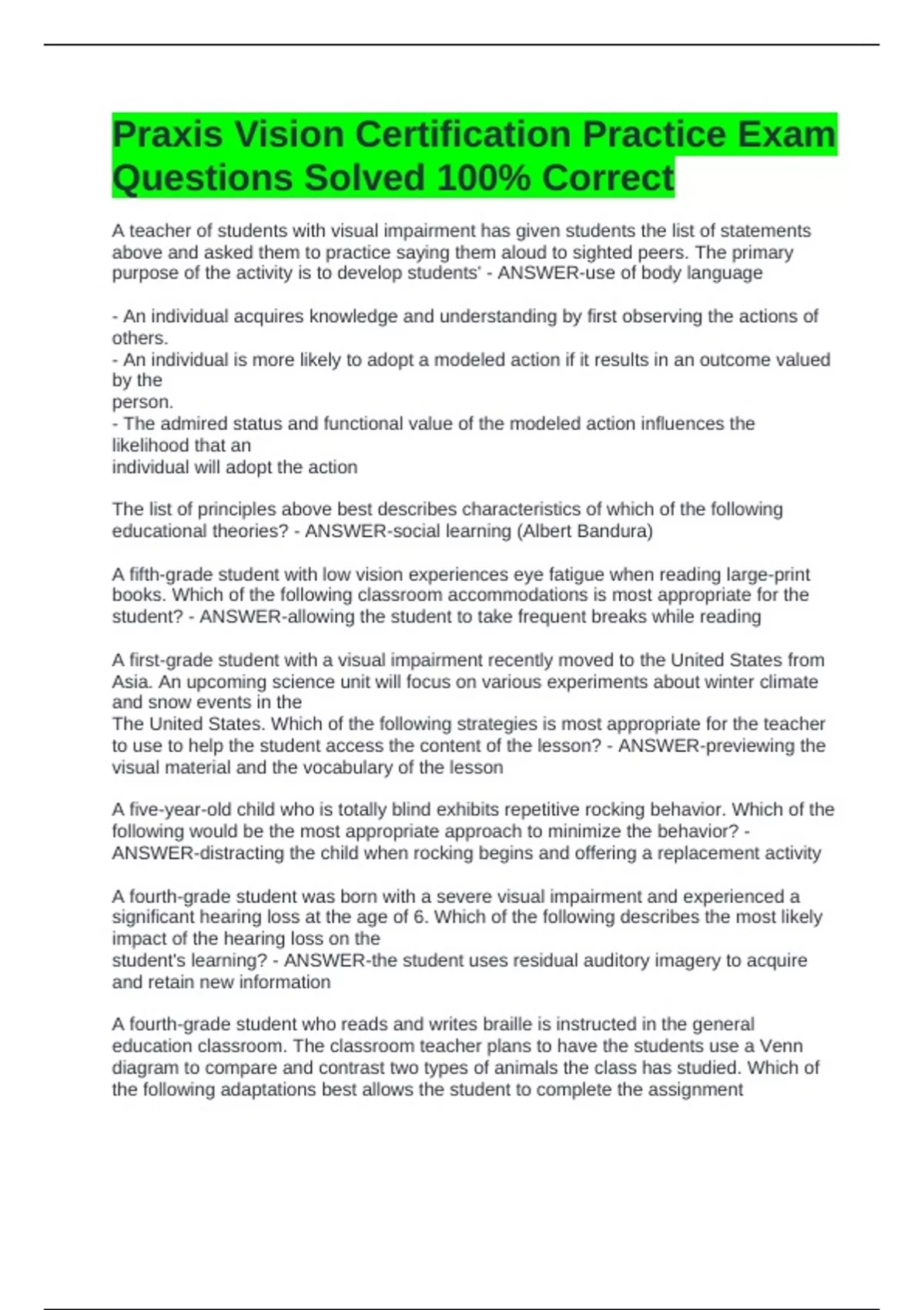 Praxis Vision Certification Practice Exam Questions Solved 100% Correct