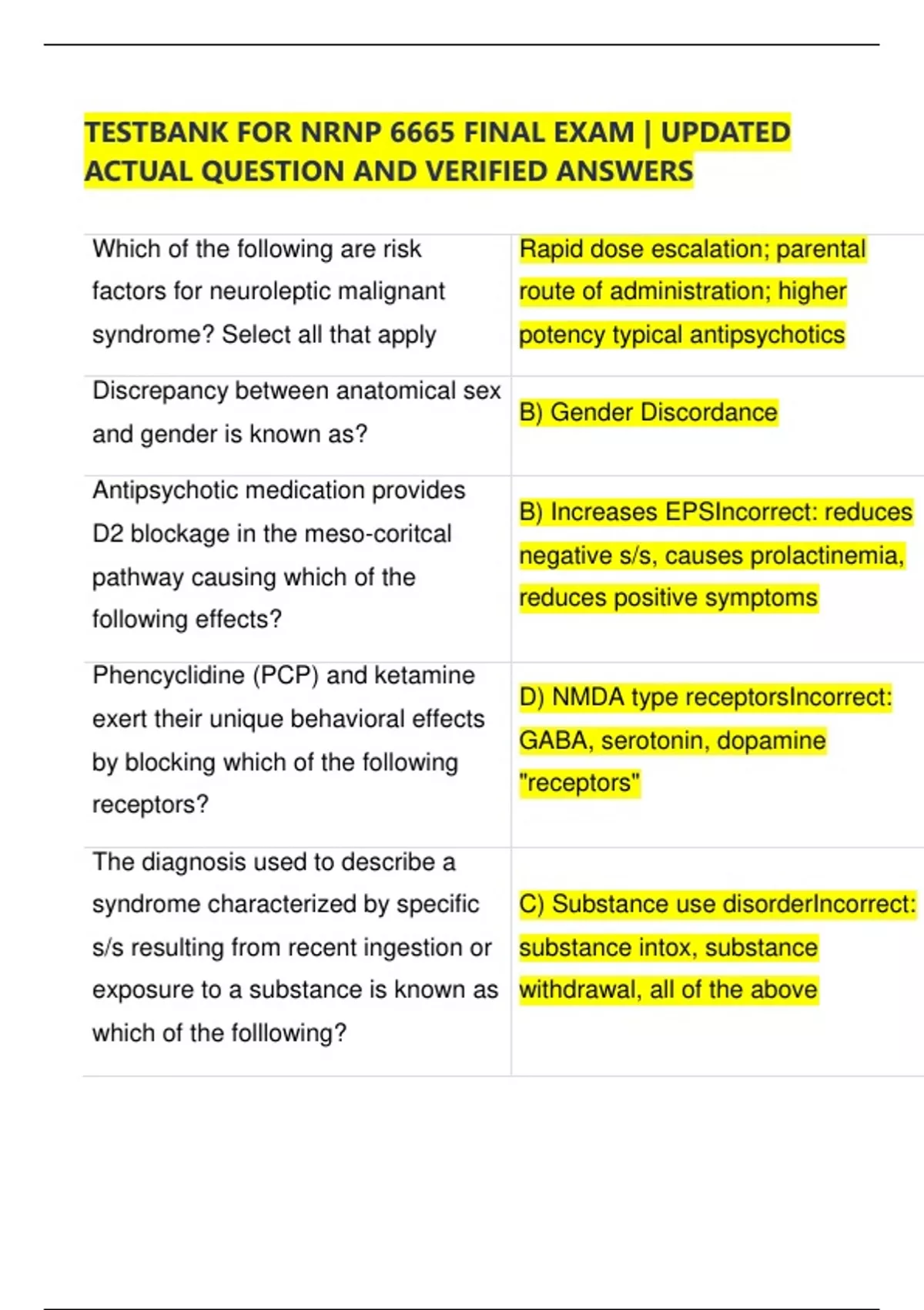 TESTBANK FOR NRNP 6665 FINAL EXAM | UPDATED ACTUAL QUESTION AND VERIFIED ANSWERS Which of the following are risk factors for neuroleptic malignant syndrome? Select all that apply Rapid dose escalation; parental route of administration; higher potency typical antipsychotics Discrepancy between anatomical sex and gender is known as? B) Gender Discordance Antipsychotic medication provides D2 blockage in the meso-coritcal pathway causing which of the following effects? B) Increases EPSIncorrect: reduces negative s/s, causes prolactinemia, reduces positive symptoms Phencyclidine (PCP) and ketamine exert their unique behavioral effects by blocking which of the following receptors? D) NMDA type receptorsIncorrect: GABA, serotonin, dopamine "receptors" The diagnosis used to describe a syndrome characterized by specific s/s resulting from recent ingestion or exposure to a substance is known as which of the folllowing? C) Substance use disorderIncorrect: substance intox, substance withdrawal, all of the above