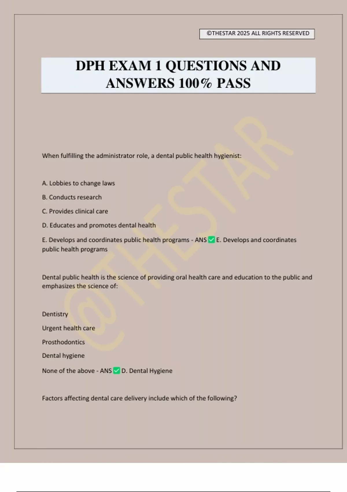 DPH EXAM 1 QUESTIONS AND ANSWERS 100% PASS When fulfilling the administrator role, a dental public health hygienist: A. Lobbies to change laws B. Conducts research C. Provides clinical care D. Educates and promotes dental health E. Develops and coordinates public health programs - ANS E. Develops and coordinates public health programs Dental public health is the science of providing oral health care and education to the public and emphasizes the science of: Dentistry Urgent health care Prosthodontics Dental hygiene None of the above - ANS D. Dental Hygiene Factors affecting dental care delivery include which of the following? ©THESTAR 2025 ALL RIGHTS RESERVED The development of the dental hygiene profession Access issues The decrease in periodontal diseases Both A and B None of the above - ANS BOTH: The development of the dental hygiene profession and Access issues The patient's ability to sue a dental provider, if that provider fails to diagnose and treat periodontal disease, is defined as: Access issues Dental insurance premiums Socioeconomic status Copayment issues Malpractice - ANS Malpractice Dental public health is a component of: Public Affairs Public Relations Public Health Community Affairs Both A and D - ANS Public Health Which of the following involves the monitoring of the health of communities? Assessment ©THESTAR 2025 ALL RIGHTS RESERVED Policy Development Assurance Serving All Functions None of the above - ANS Assessment Which of the following is the process by which society makes decisions about problems? Assessment Policy Development Assurance Serving All Functions None of the above - ANS Policy Development Which of the following involves making certain that all populations have access to appropriate and cost-effective services to read agreed-upon public health goals? Assessment Policy Development Assurance Service All Functions None of the above - ANS Assurance Which of the following includes the research for new insights and innovative solutions to health problems? Assessment Policy Development