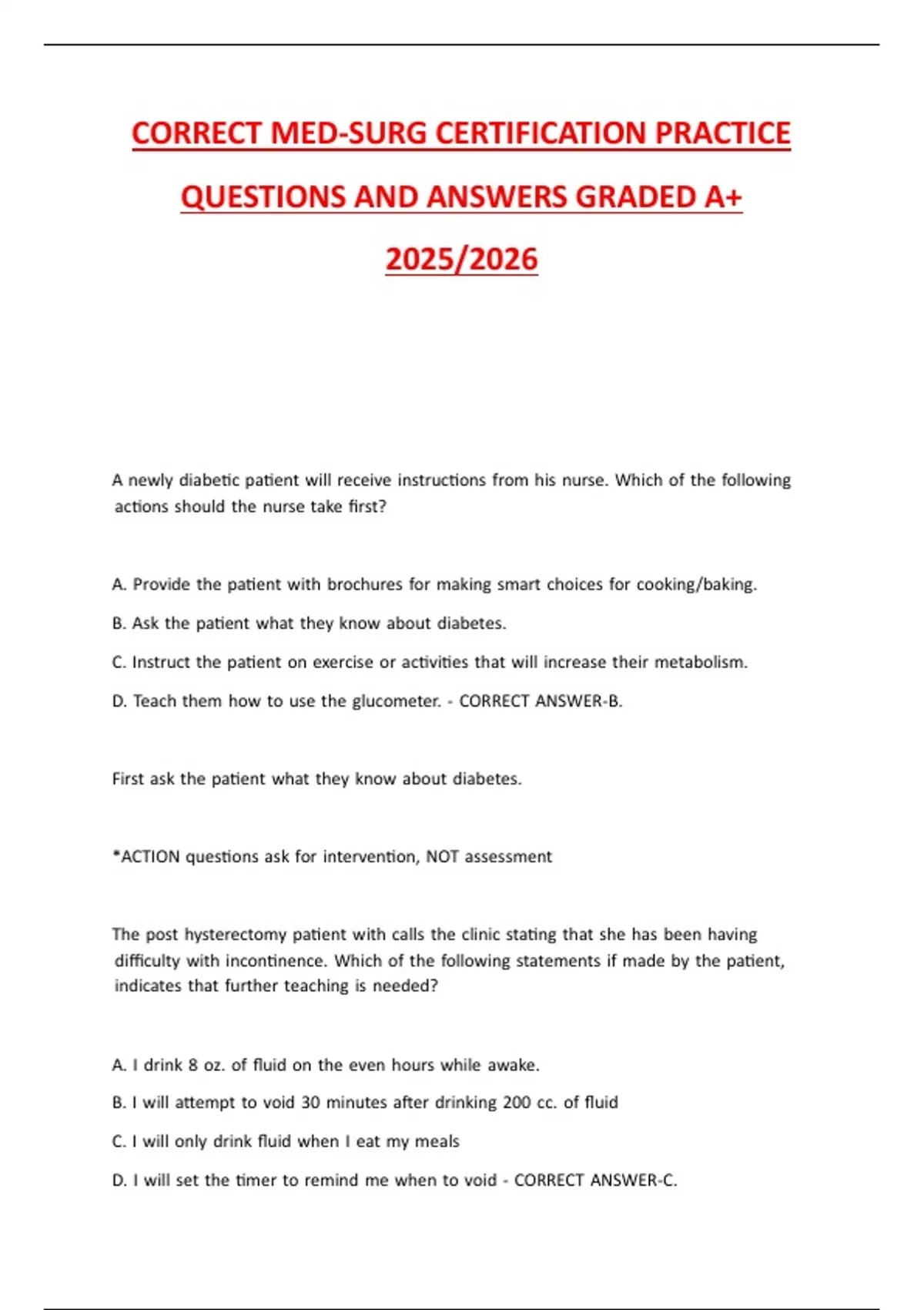 CORRECT MED-SURG CERTIFICATION PRACTICE QUESTIONS AND ANSWERS GRADED A+ 2025/2026 CORRECT MED-SURG CERTIFICATION PRACTICE QUESTIONS AND ANSWERS GRADED A+ 2025/2026 CORRECT MED-SURG CERTIFICATION PRACTICE QUESTIONS AND ANSWERS GRADED A+ 2025/2026 CORRECT MED-SURG CERTIFICATION PRACTICE QUESTIONS AND ANSWERS GRADED A+ 2025/2026 CORRECT MED-SURG CERTIFICATION PRACTICE QUESTIONS AND ANSWERS GRADED A+ 2025/2026