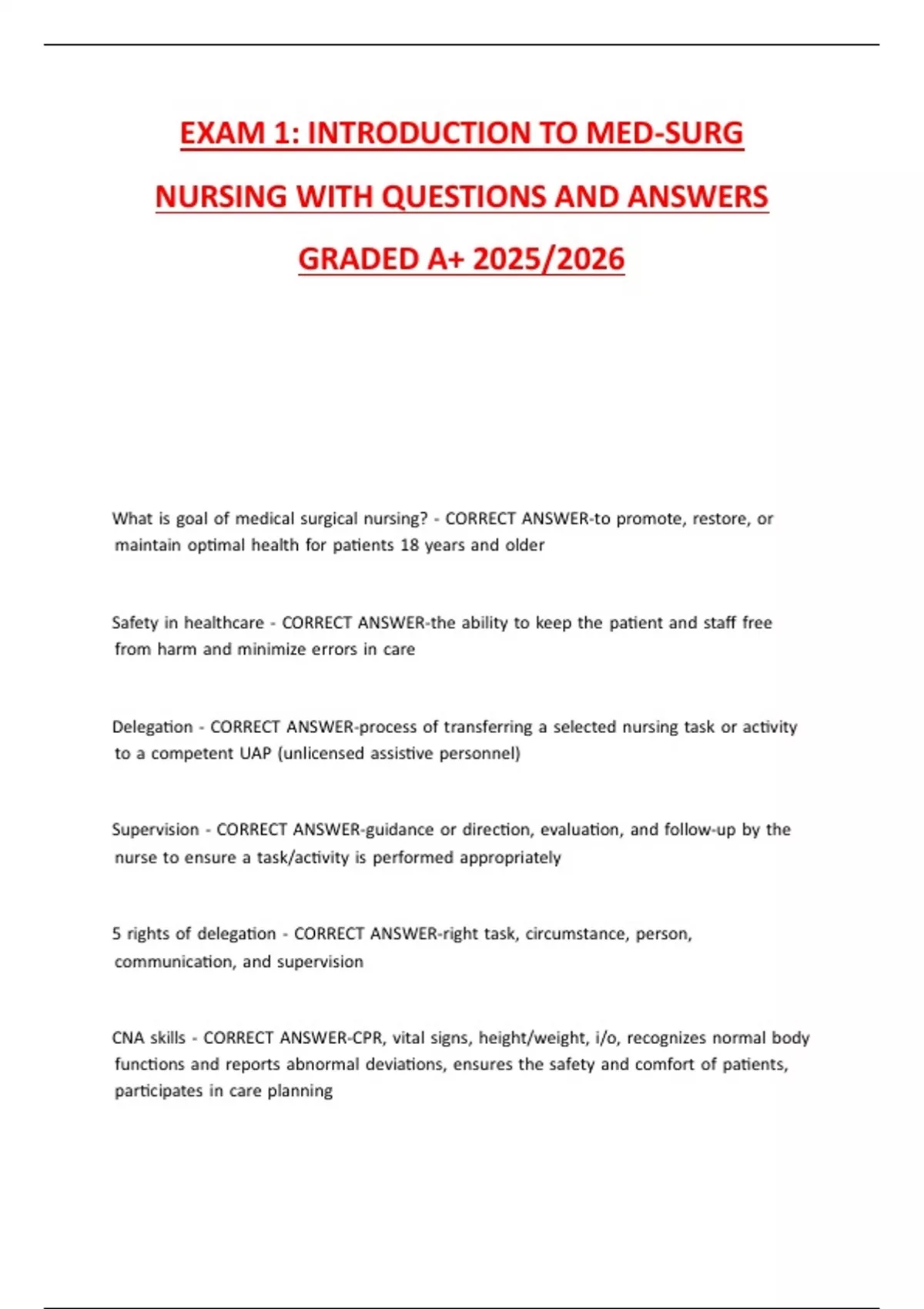EXAM 1: INTRODUCTION TO MED-SURG NURSING WITH QUESTIONS AND ANSWERS GRADED A+ 2025/2026