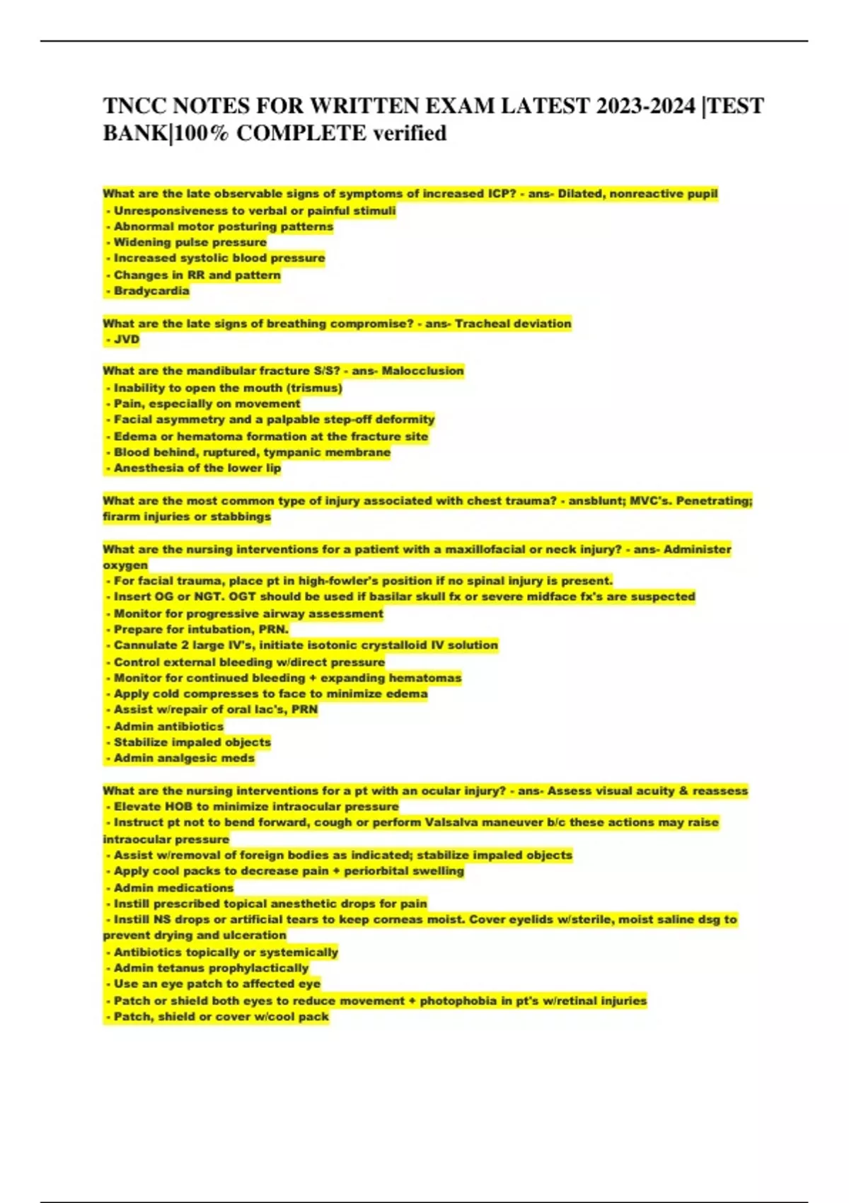 ,TNCC NOTES FOR WRITTEN EXAM LATEST 2023-2024 |TEST