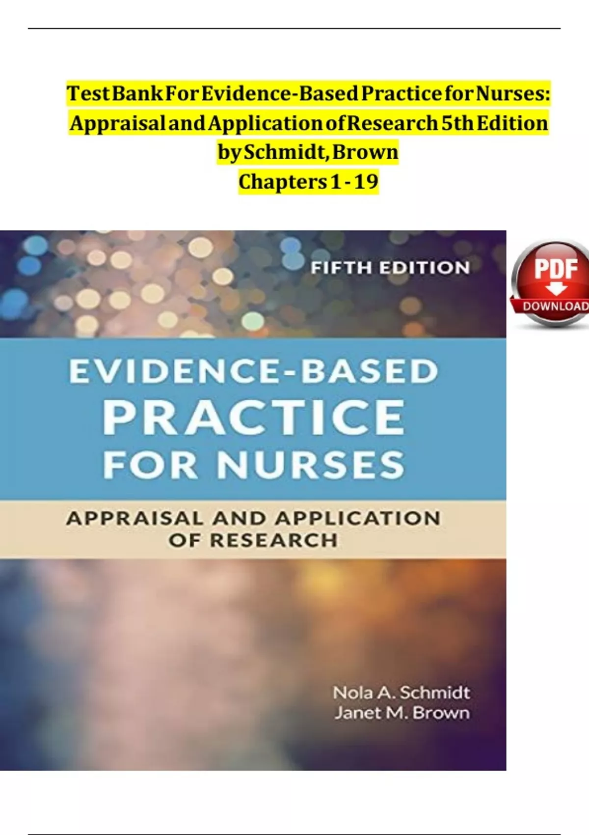 Test bank for Schmidt & Brown 4th Edition Evidence-Based Practice for Nurses: Appraisal and Application of Research CHAPTER 1 WHAT IS EVIDENCE BASED PRACTICE? Multiple Choice 1. Which of the following is the best definition of research? 2. Critically thinking about problems that occur in health care to determine possible solutions. 1. Information that is based on personal experience or tradition. 2. Planned and systematic activity that leads to new knowledge and/or the discovery of solutions to problems or questions. 1. Trying a variety of approaches to a clinical problem and settling on the approach that is effective more often than not. Definition of research utilization (p. 4) 2. Which of the following is the best definition of research utilization? 3. Applying research findings from individual studies to practice. 4. Analyzing multiple research studies to synthesize findings. 5. Appreciating the importance of clinical decision making. 6. Using previous personal experience to build confidence. Definition of EBP (pp. 4-5) 3. Which of the following is the best definition of evidence-based practice (EBP)? 4. Application of research findings based on scientific theories in a clinical setting. 5. Research studies that correspond to nationally established priorities for healthcare, conducted by experts in their fields. 1. Use of theory-derived, research-based information in making decisions about health care delivery, with consideration of individual needs and preferences and the clinical expertise of the provider. 1. Using the individual health care provider’s perception of truth without conscious attention or reasoning. Difference between research utilization and EBP (pp. 4-5) 4. Which of the following best describes the difference between research utilization and EBP? 1. Research utilization is a process of evaluating multiple studies for the most generalizable findings; EBP is use of the most recent study on a topic. 1. Research utilization involves changing practice based on findings of a single research study; EBP is the syntheses of findings from multiple studies to incorporate with practitioner skills and client preference to determine best care. 1. Research utilization is the application of research findings to health care practice; EBP is considered in selecting medication options. 1. Research utilization is review of research publications; EBP is using the healthcare provider’s perception of what care would be best in individual situations. Evidence from other disciplines (p. 6) 5. In what way can evidence from disciplines other than nursing be helpful? 6. Theory based non-nursing evidence can provide a basis on which to build new evidence. 1. Non-nursing evidence supports the use of nursing