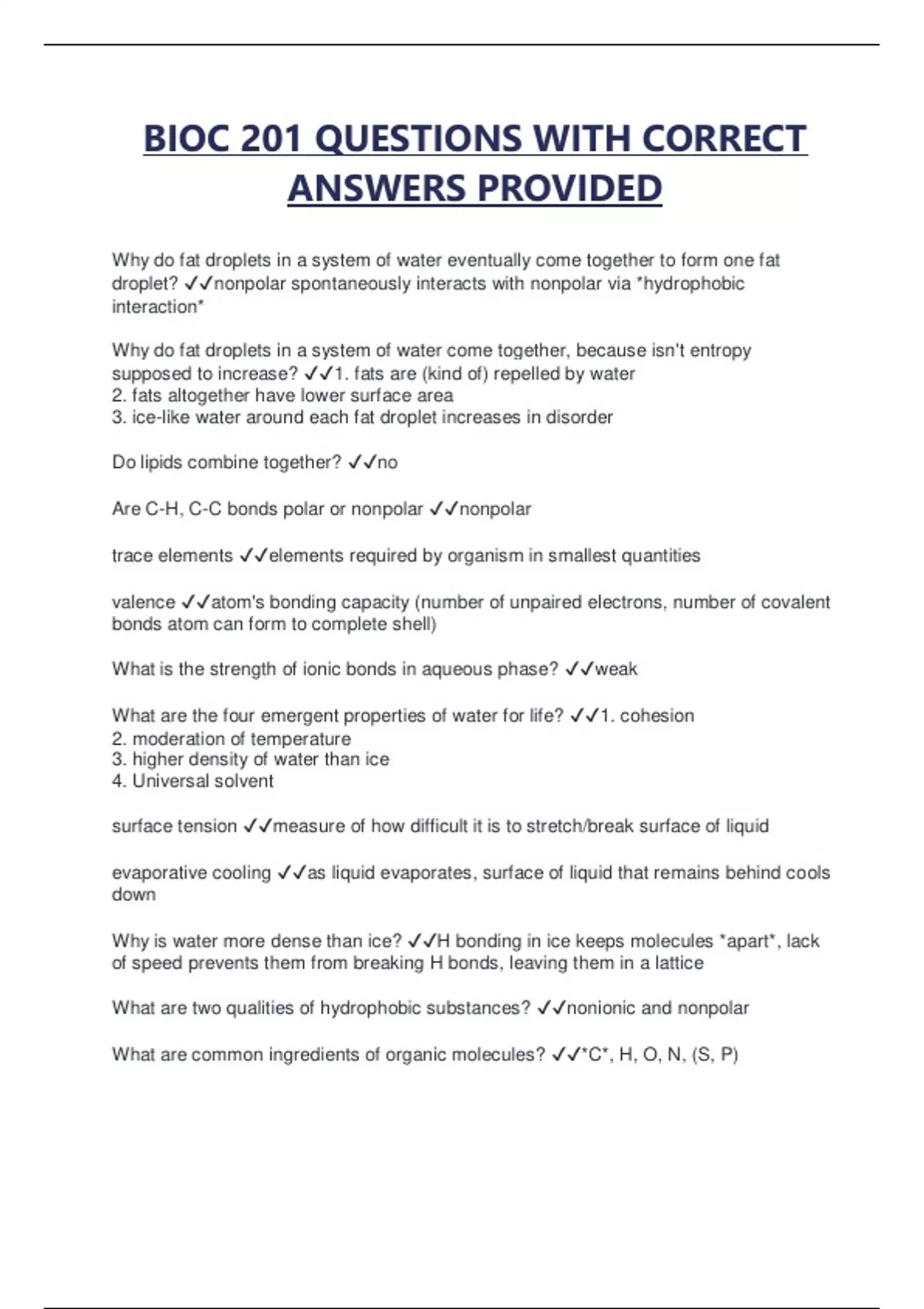BIOC 201 QUESTIONS WITH CORRECT ANSWERS PROVIDED Why do fat droplets in a system of water eventually come together to form one fat droplet? nonpolar spontaneously interacts with nonpolar via *hydrophobic interaction* Why do fat droplets in a system of water come together, because isn't entropy supposed to increase? 1. fats are (kind of) repelled by water 2. fats altogether have lower surface area 3. ice-like water around each fat droplet increases in disorder Do lipids combine together? no Are C-H, C-C bonds polar or nonpolar nonpolar trace elements elements required by organism in smallest quantities valence atom's bonding capacity (number of unpaired electrons, number of covalent bonds atom can form to complete shell)