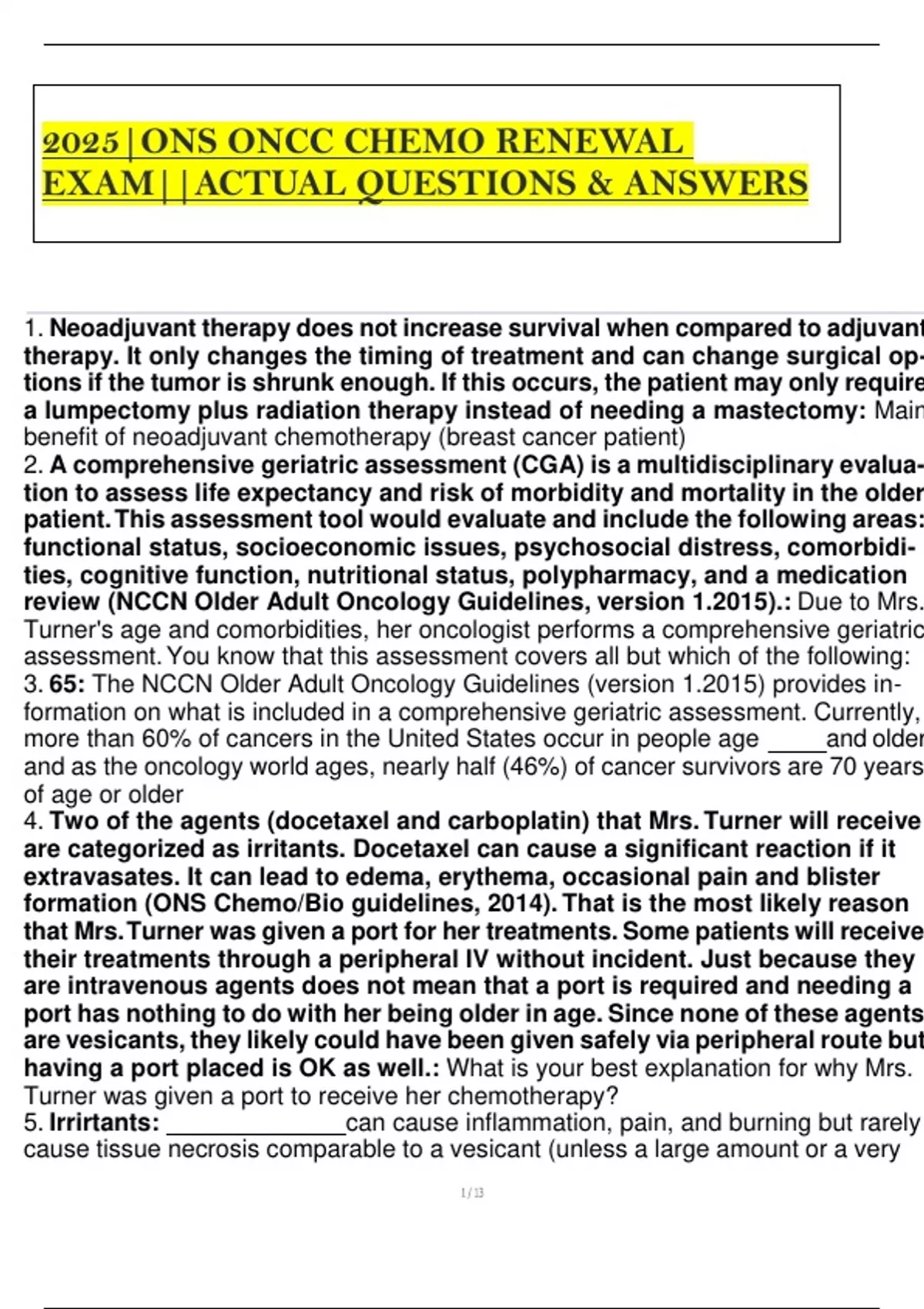 2025|ONS ONCC CHEMO RENEWAL EXAM||ACTUAL QUESTIONS & ANSWERS 1. Neoadjuvant therapy does not increase survival when compared to adjuvant therapy. It only changes the timing of treatment and can change surgical op- tions if the tumor is shrunk enough. If this occurs, the patient may only require a lumpectomy plus radiation therapy instead of needing a mastectomy: Main benefit of neoadjuvant chemotherapy (breast cancer patient) 2. A comprehensive geriatric assessment (CGA) is a multidisciplinary evalua- tion to assess life expectancy and risk of morbidity and mortality in the older patient. This assessment tool would evaluate and include the following areas: functional status, socioeconomic issues, psychosocial distress, comorbidi- ties, cognitive function, nutritional status, polypharmacy, and a medication review (NCCN Older Adult Oncology Guidelines, version 1.2015).: Due to Mrs. Turner's age and comorbidities, her oncologist performs a comprehensive geriatric assessment. You know that this assessment covers all but which of the following: 3. 65: The NCCN Older Adult Oncology Guidelines (version 1.2015) provides in- formation on what is included in a comprehensive geriatric assessment. Currently, more than 60% of cancers in the United States occur in people age and older and as the oncology world ages, nearly half (46%) of cancer survivors are 70 years of age or older