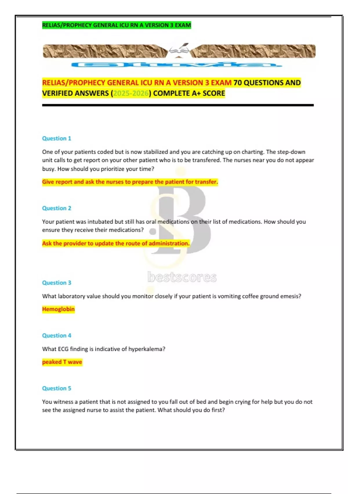 RELIAS/PROPHECY GENERAL ICU RN A VERSION 3 EXAM 70 QUESTIONS AND VERIFIED ANSWERS () COMPLETE A+ SCORE
